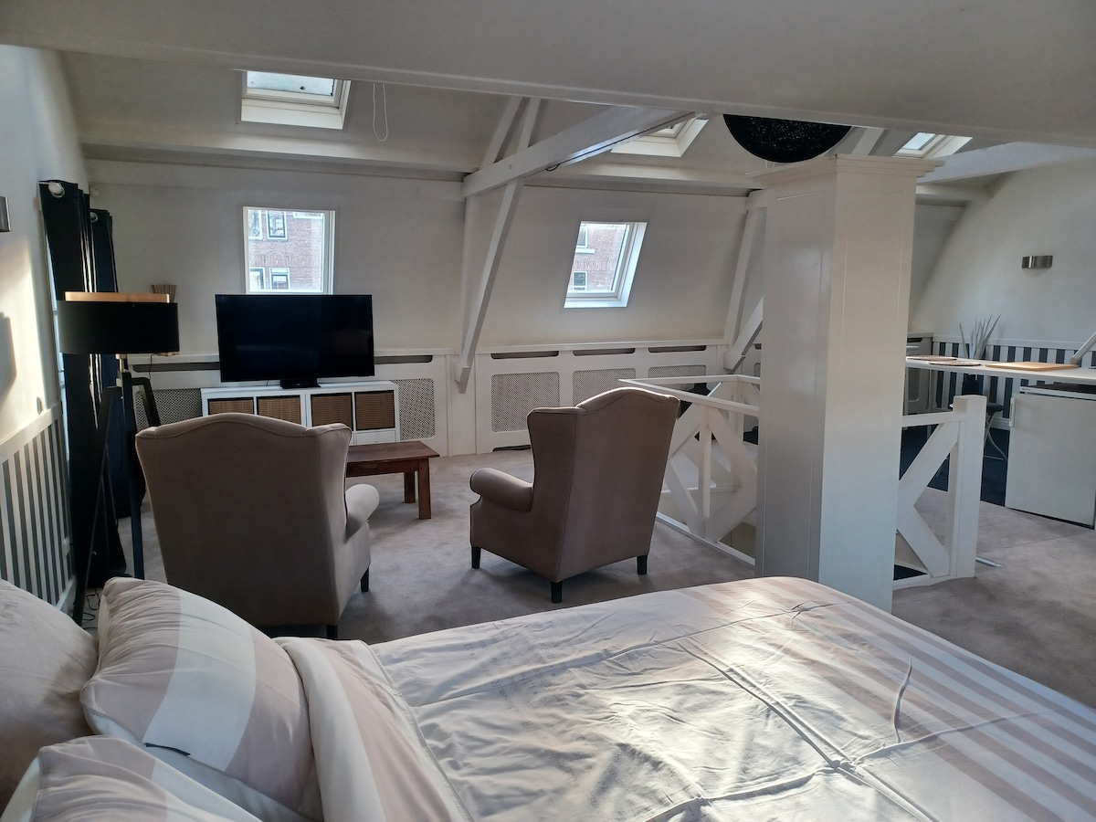 En unik svit med egen ingång, belägen på bottenvåningen i en gammal butiksbyggnad där Joris och hans barn har sitt hem. Med butiksfönster och originalgolv erbjuder detta lilla hus inom ett hus allt för en härlig semester. Vackert renoverad av ägaren själv, loftet är det perfekta gömstället mitt i det gamla centrala distriktet i Tilburg, med många butiker, restauranger och barer. En bekväm vindsvåning fullt inredd för 3 personer, och det på bara 25 m2!