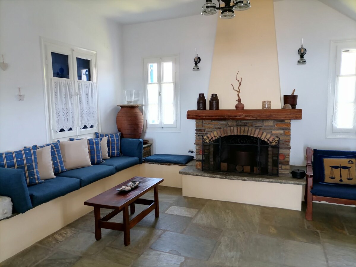 Helt utrustat hus i ett lugnt och privat område vid havet, mellan två underbara stränder på vår ö, Agios Romanos och Apigania!!Fantastisk utsikt!!!! På stranden i Agios Romanos finns det tillgång med bil men också via en stig (5 minuter) och det finns en organiserad strandbar, taverna och kafeteria. Stranden i Apigania är orörd, oorganiserad och har endast tillgång via en stig (5-10 minuter)!!Parkeringsplats finns tillgänglig inom fastigheten.
