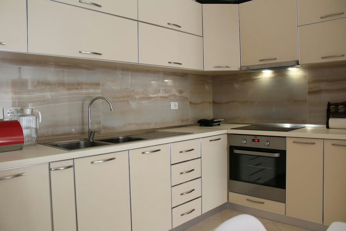 Dyk ner i elegansen och lyxen i denna lägenhet. En unik och rymlig plats för alla som söker efter en magisk vistelse i Tirana. Med ett fantastiskt läge, bara 800 m från stadens centrum och 37 minuters bilresa från flygplatsen, är denna lägenhet rätt plats att tillbringa dina dagar och nätter. Spara detta boende för ett speciellt datum. Ha en trevlig vistelse i Sias lägenhet!