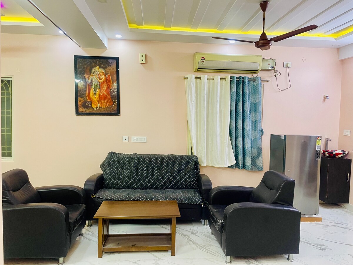 Detta är en lägenhet med 2 sängar och 2 badrum med ett fullt utrustat kök. Gästerna får tillgång till hela lägenheten. Varje våning har bara en lägenhet så att du kommer att ha ett överflöd av integritet. Fullt fungerande kök , höghastighets Wi-Fi, två AC-sovrum, två badrum med hög kapacitet gejsrar ,vattenfilter , kylskåp, tvättmaskin och TV . Reservkraft och hiss finns. Läget ligger nära Zoo, TCS iON Digital Zone, Cherlopalli circle, Srinivasa mangapuram, 8 km till Alipiri.