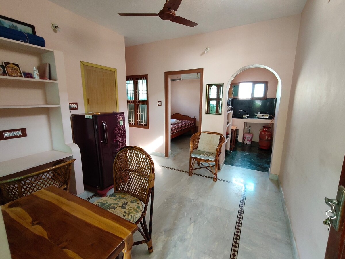 Rymligt och ljust hem med lugnt och tyst område nära ramana . Det finns en högkvalitativ madrass, modernt kök. 5 min promenad från ramana ashram, nära Siva Sathi ashram, nära utmärkt Dreaming Tree matupplevelse, etc...