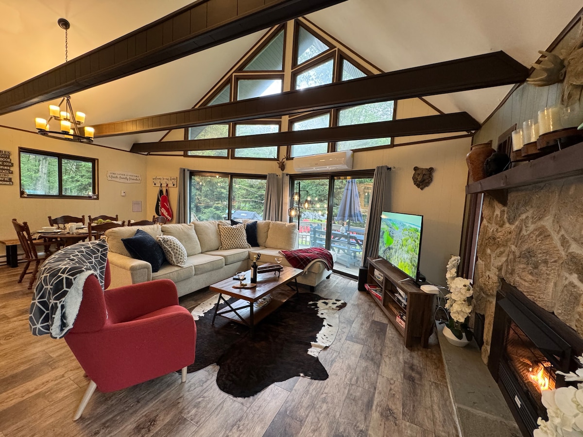 🎱 Pool table 🍽️ Dining table seats 16 🥅 Air hockey 🔥 Wood burning fireplace 🏓 Ping pong 🥩 Weber gas grill ⚽️ Foosball 🏡 Sprawling 3,000 sqft 🚴♂️ Peloton 🪵 Firepit in backyard ★ 6-person, aromatic cedar barrel sauna ★ Separate dining room & living room ★ Mudroom for your golf & ski gear ★ Sunny front deck with forest views ★ Secluded 2 acre plot ★ 4 bedrooms + sleeping loft ❄️ At the gates of Jack Frost Ski Resort ❄️