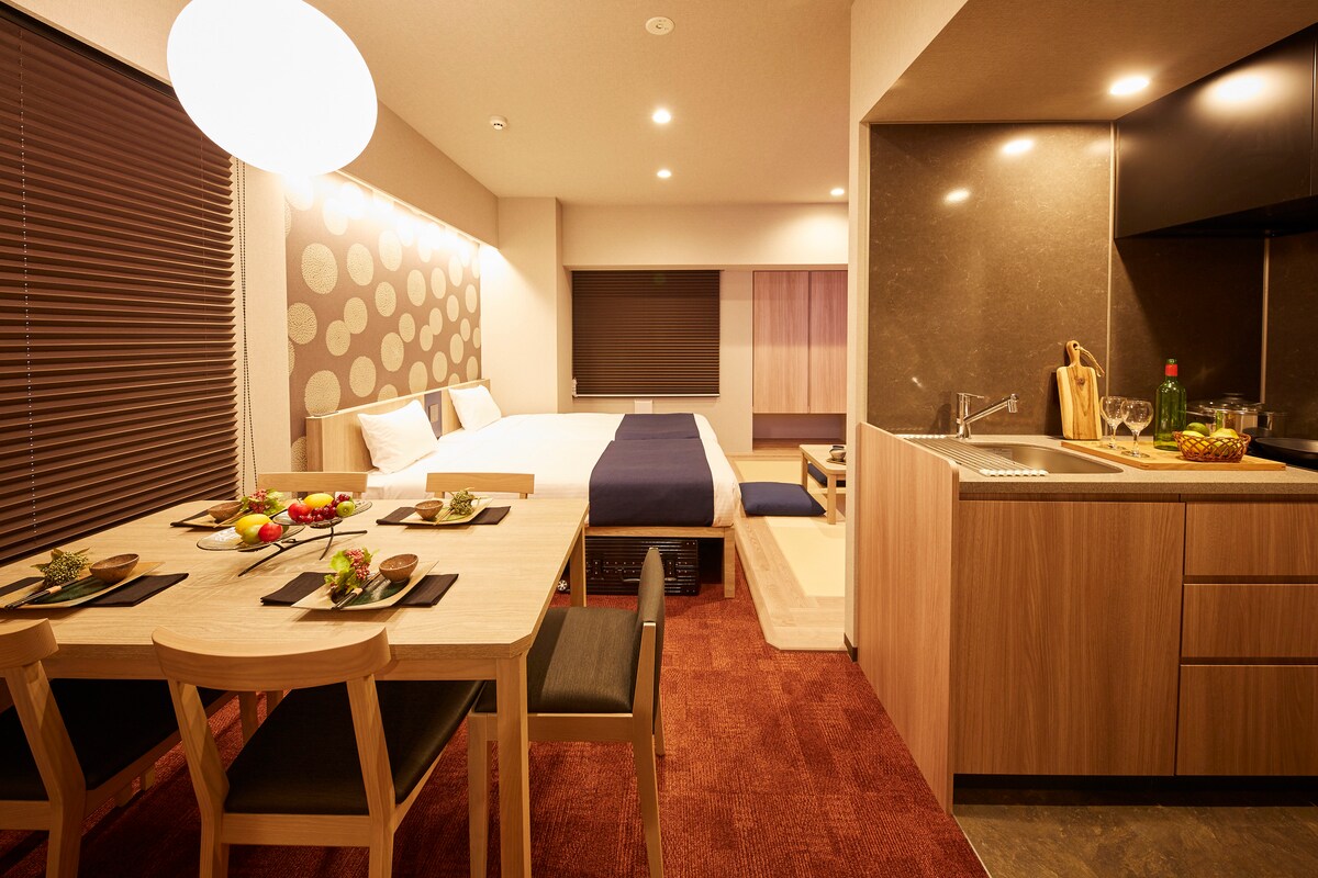 Det är bekvämt för hela familjen att åka vart som helst på detta centralt belägna ställe. Rummet är inrett med två king size-sängar, vilket gör det idealiskt för familjer och kompisgrupper. Avståndet mellan sängarna är bekvämt, och planlösningen ger ett avskilt utrymme.Lämplig för att sova upp till 5 personer. Det öppna köket är utrustat med en induktionsspis, kastruller, stekpannor och porslin, så att du enkelt kan laga hemlagad mat eller enkla japanska rätter. Barbänken förbinder vardagsrummet och matplatsen, vilket gör den perfekt för allt från morgonkaffe till kvällsmåltid. Handfatet och badrummet är utformade separat, så även om flera personer bor tillsammans kan de var och en hålla sin egen takt. Att lyssna på musik via Bluetooth-stereo och ta ett varmt bad på kvällen i Japan är det mest avkopplande ögonblicket under resan. Rummet är utrustat med en projektor som enkelt kan anslutas till populära digitala streamingplattformar. Fullt utrustat med tvättmaskin, luftrenare, strykjärn och en rymlig garderob – vi har allt du behöver. Boendet är precis lagom, perfekt för en person som vill arbeta i lugn och ro vid bardisken, eller för några dagar med vänner eller familj. Vi hade jättetrevligt, och alla var bekväma.