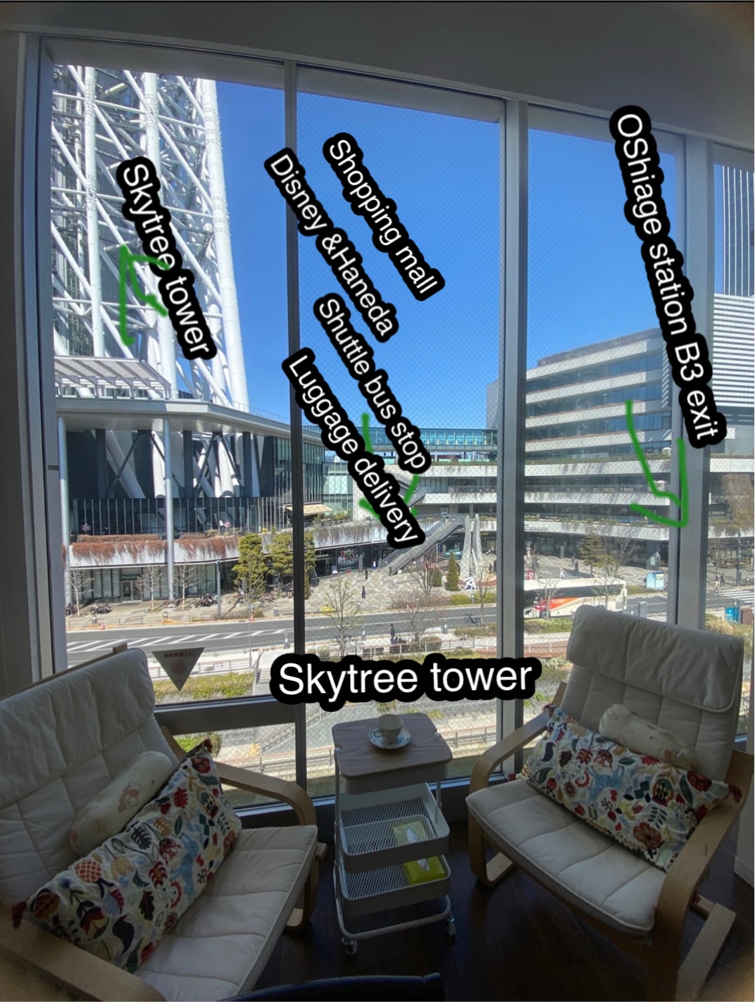 Tillgång: 2 stationer med 5 linjer 1. Oshiage station→ 6 min promenad Direkt tillgång till både till Narita och Haneda 2. Tobu skytree station→ 1 min promenad Direkt tillgång till Asakusa/Nikko (båda är världsarv) Sevärdhet: Endast 1 minuters promenad till skytree! 15 minuters promenad till Asakusa tempel. De flesta attraktioner i Tokyo ligger inom 30 minuter med tåg Boende: Inom 10 minuters promenad finns 4 stormarknader och massor av närbutiker Shopping: 1 minuters promenad till skytree shopping mall. Vi kan också tala日本語/中文/閩南語.