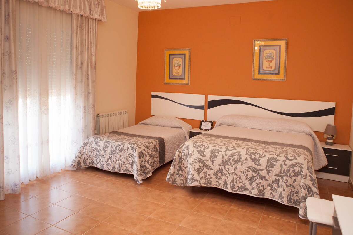 Rum med dubbelsäng + extrasäng, terrass och panoramautsikt över staden Toledo. Max 2 vuxna och 1 barn under 11 år. Vi kan lägga till (på begäran och godkännande) en spjälsäng istället för en extrasäng för en bebis, men observera att den maximala kapaciteten är 3 personer inklusive barn och spädbarn. Vår anläggning ligger bara 1 km från gamla stan, som kan nås till fots och har gott om gratis utomhusparkering (inga bokningar)