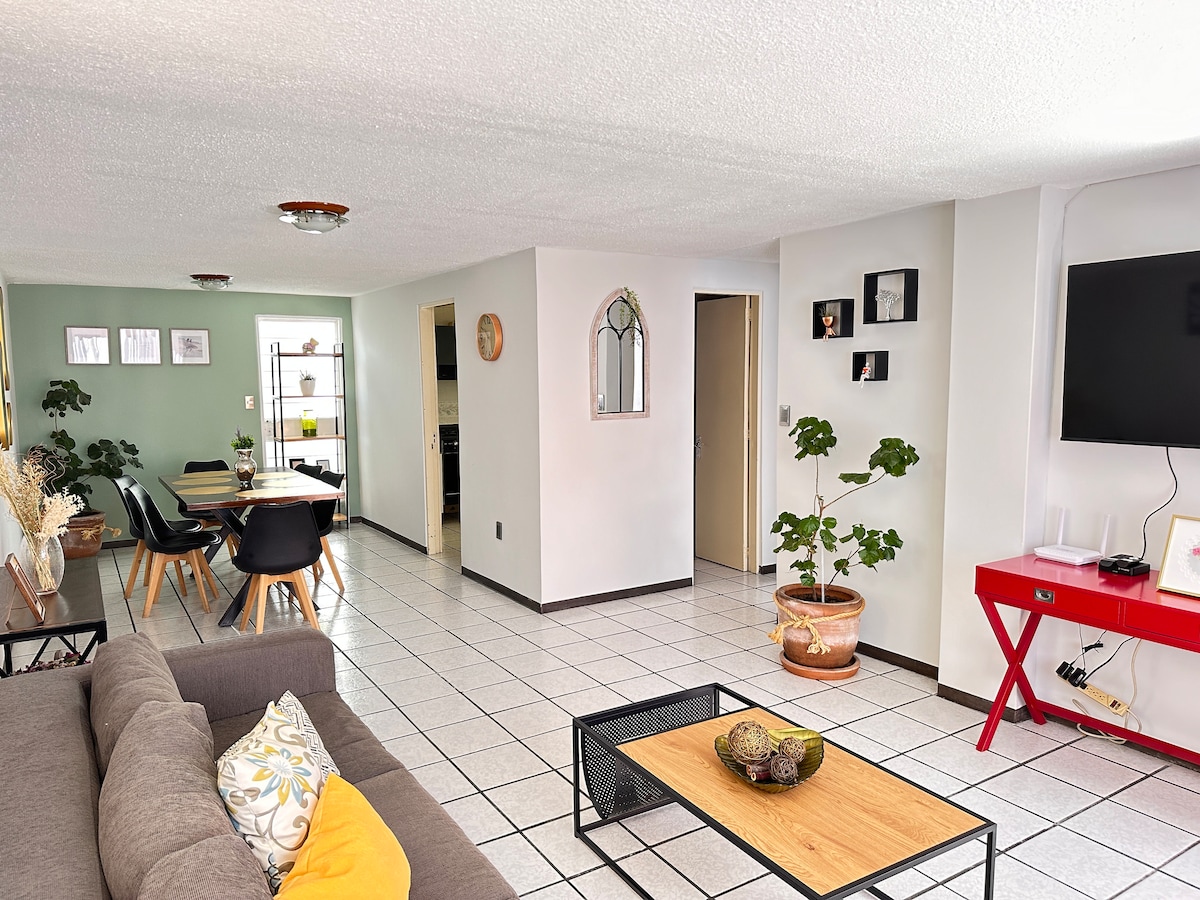 Modern vindsvåning med dubbel höjd, fullt utrustad. Bra läge för affärs- och arbetsresor; vi har fakturering och erbjuder rabatter för längre vistelser. 600 MB internettjänst och TotalPlay TV. Sovrum med queen-säng på övervåningen och vardagsrum med bäddsoffa, 1,5 badrum, mini-split luftkonditionering. Fullt utrustat kök, tvättmaskin, privat parkering och grönområden.