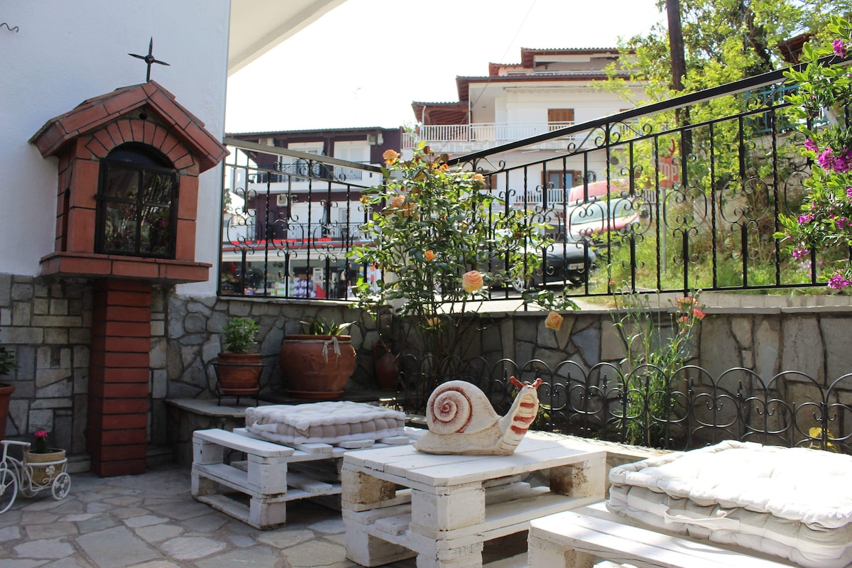 "Vi välkomnar dig till vårt ställe, som vi har ordnat så att du kan få en trevlig vistelse . Rummen och hela huset är nybyggda och färdiga 2022. Vi ligger 150 meter från centrum av Neos Marmaras och 50 meter från huvudstranden, i ett lugnt grannskap som ger dig tillgång till soupermarknader, restauranger ,kaféer, barer och underhållningsställen bara 5 minuters promenad. Du får en fullständig uppdatering när du checkar in