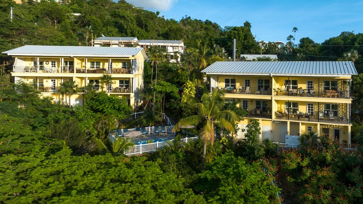 Denna rymliga enhet ("Mango") kommer att tillhandahålla alla väsentligheter för din semester i St John. PLUS RESERVBATTERI! Det finns 2 sovrum med luftkonditionering och dubbelsängar, ett fullt utrustat kulinariskt kök och matsal. Det rymliga vardagsrummet har en Queen bäddsoffa, wifi, tv och dedikerad arbetsyta. Njut av avkoppling på din privata uteplats med utsikt över de vackra Jungfruöarna och Nationalparken. All utrustning för stranden ingår och en tvättmaskin och torktumlare i boendet också!