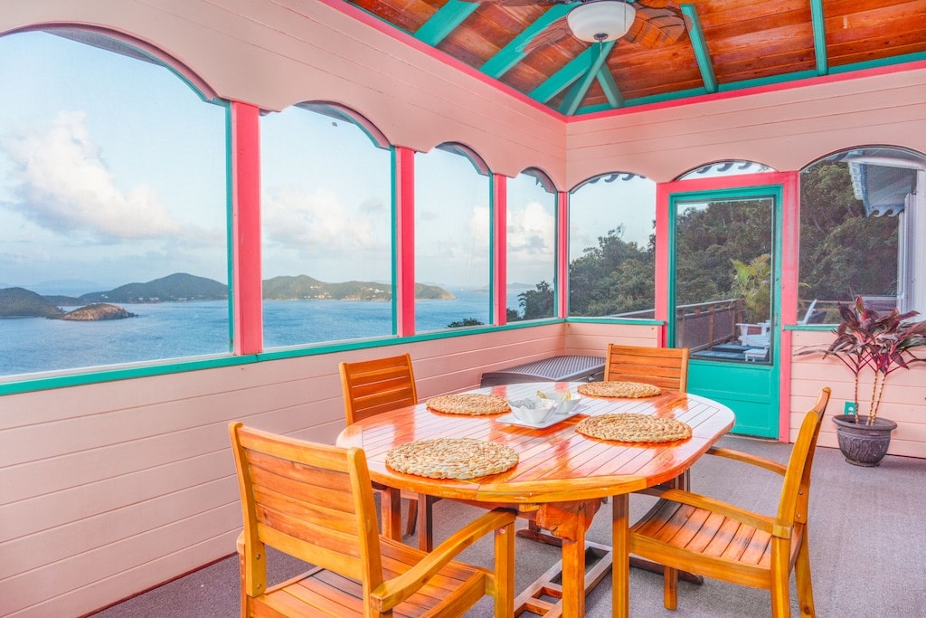 Det finns miljontals dollar utsikt från verandorna i detta hus. Beläget uppe på en kulle har den utsikt över den östra änden av St John. Huvudhuset har en separat sovrumskapsel med en dubbelsäng. Huvudbyggnaden har vardagsrum och matplatser för 4, fullt utrustat kök och badrum med en utomhusdusch. Privat bubbelpool för två personer. Gäststugan är en studio utrustad med ett fullt utrustat kök, dubbelsäng, soffa, TV, inomhus och utomhus matplats för 2. Privat bubbelpool för två personer.