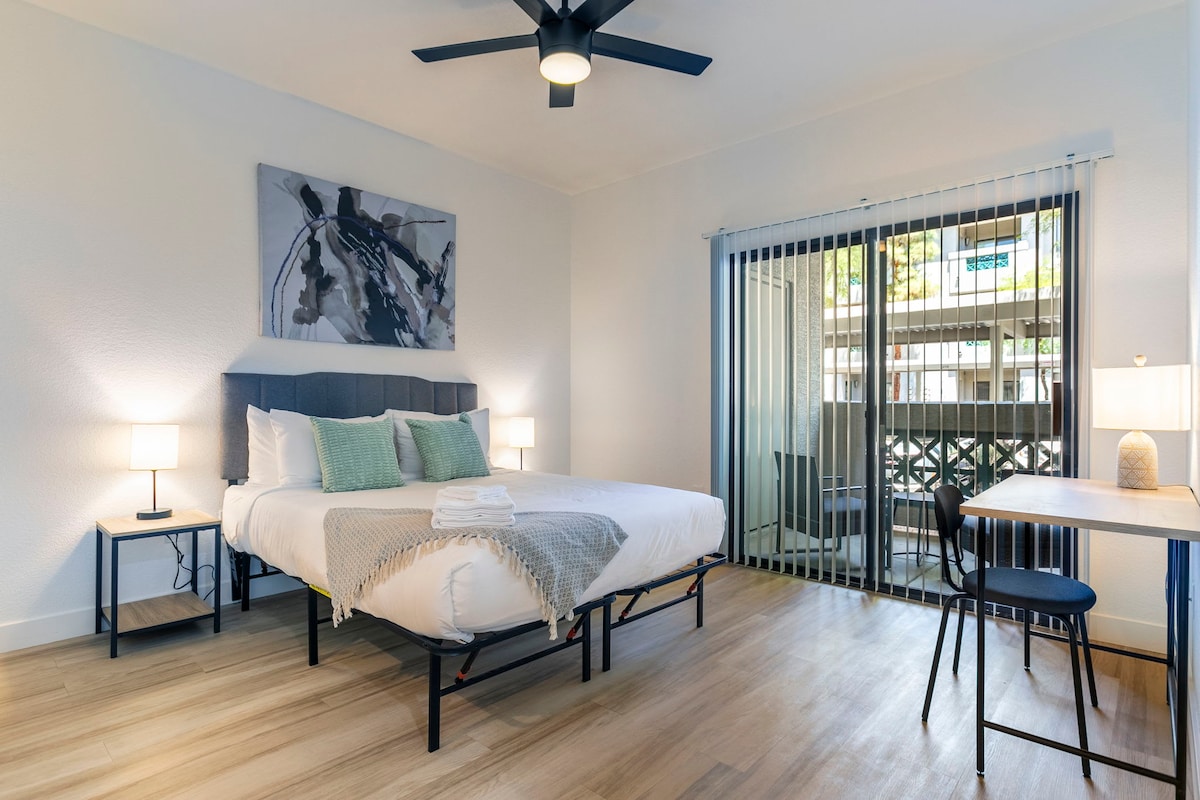 Upplev Scottsdale i en rymlig lyxig lägenhet med spektakulära vibbar och bekvämligheter. Enheten: → Blixtsnabbt Wi-Fi → Dedikerad arbetsyta + bildskärm → Bekväm säng i King-storlek → 60" Vardagsrum TV + Netflix → 55 tums TV i sovrummet + Netflix → Fullt utrustat kök → Tvättmaskin och torktumlare → Privat parkering 5-stjärniga bekvämligheter: → Semesteranläggning Pool och Jacuzzi → Cabanas och lounger → Full storlek Gym Perfekt för affärsresenärer och företagskunder som vill uppleva den rika kulturen i Scottsdale med stil.