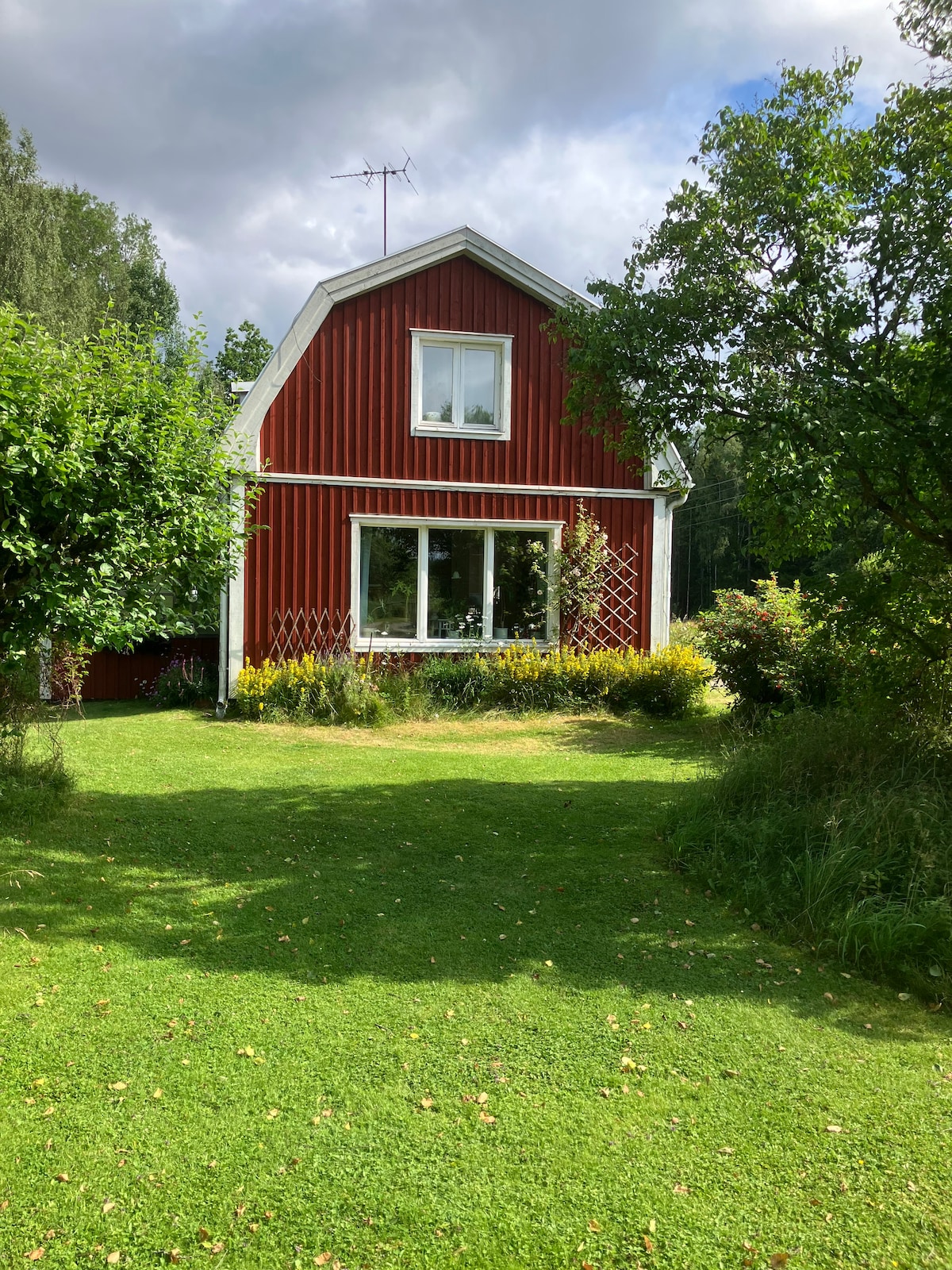 Stuga med kök och badrum på första våning och sovrum/tv-rum på övervåning, med utsikt över sjön. Den ligger på tomten där vi bor, en familj på två vuxna, två barn och liten hund. På-landet-känsla med nära till skog och mark, promenad- och cykelstigar, bad och fiske i både Sämsjön och Åsunden. Flera mil med asfalterade cykelvägar även idealisk för rullskidor med start utanför dörren. Efter överenskommelse kan båt hyras. Självplock av äpplen under säsong.