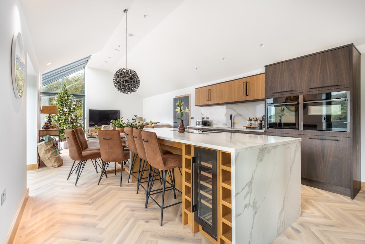 Njut av en lyxig vistelse med en fantastisk utsikt i denna dolda pärla i den charmiga och historiska staden Penryn, precis vid Falmouth. Njut av en imponerande panoramautsikt från din bekväma säng och varva ner i ett lyxigt badrum utrustat med en vattenfalldusch. Boendet har ett rymligt, fullt möblerat och utrustat modernt kök, ett elegant vardagsrum, elbilsladdare och en altan för en lugn och avkopplande upplevelse. Perfekt för par, familjer och yrkesverksamma.