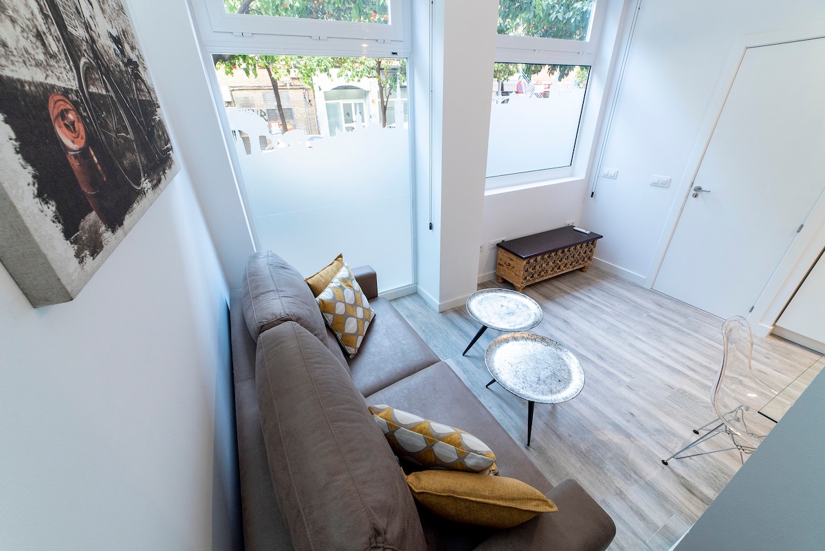 Ljust, modernt 55 kvm loft mitt i det historiska hamnområdet Arenal, 3 minuter till tjurfäktningsarenan och bredvid flodpromenaden. Mysig industriell design för att må bra. Höga rum, stora fönster. Ingen trafik/pubbuller. Perfekt för avkoppling efter stadsbesök eller arbetsdag. Endast 3-10 minuters promenad till de största sevärdheterna, kaféer, restauranger, tapas, butiker, nattliv Fullt utrustat kök, 2 badrum. 2 dubbelsängar, 1 bäddsoffa. Direkt ingång utan trappor. Nyrenoverad.