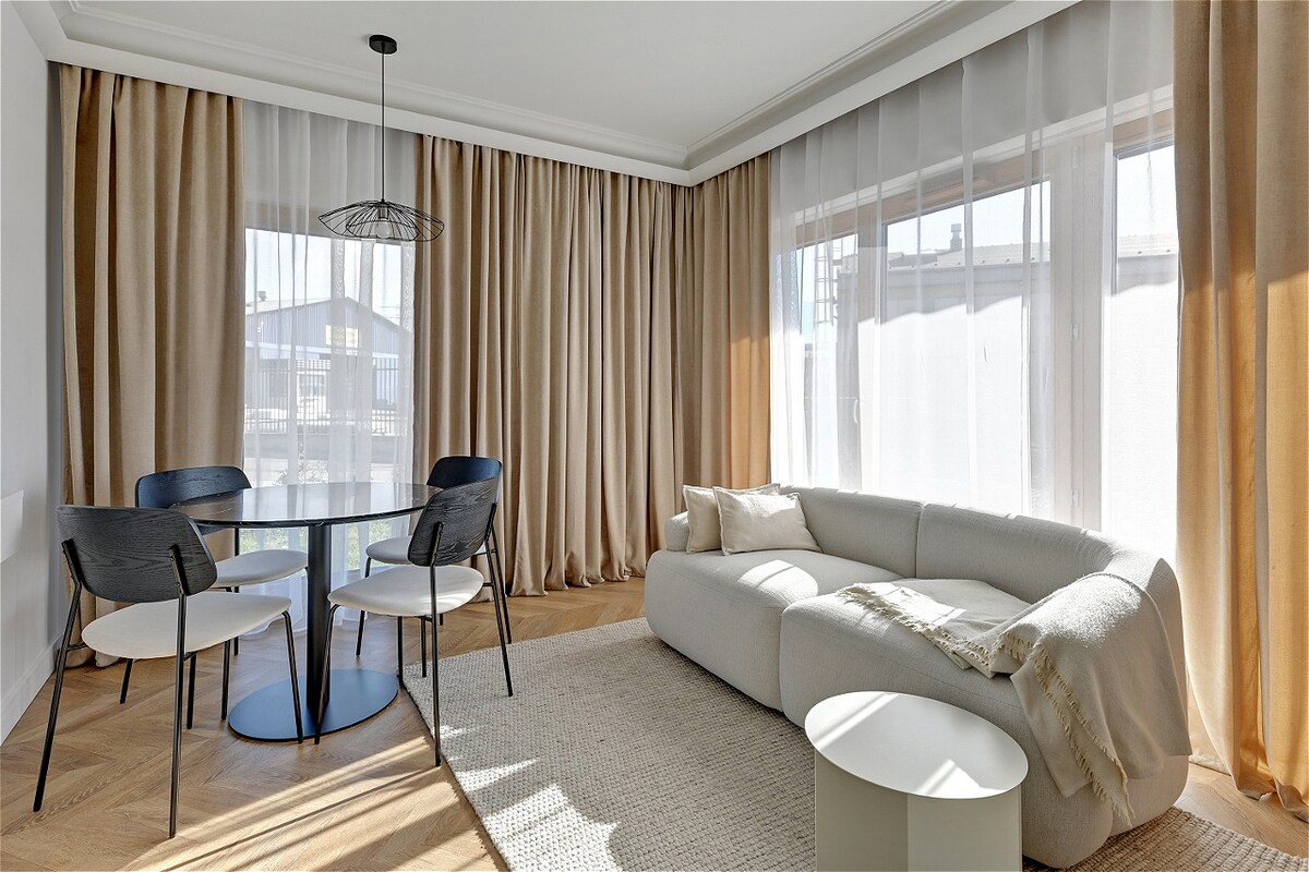 En unik lägenhet med uppmärksamhet på varje detalj. Lägenheten på 96 m2 ligger på 6:e, översta våningen med en fantastisk utsikt över Gamla stan, floden och observationshjulet. Gästerna har tillgång till 3 sovrum och ett rymligt vardagsrum med pentry. Lägenheten har också 2 badrum, 2 balkonger och en garderob. Byggnaden har dygnet runt säkerhet. Dessutom finns ett gym, yogarum, bastu (extra kostnad), relaxavdelning.