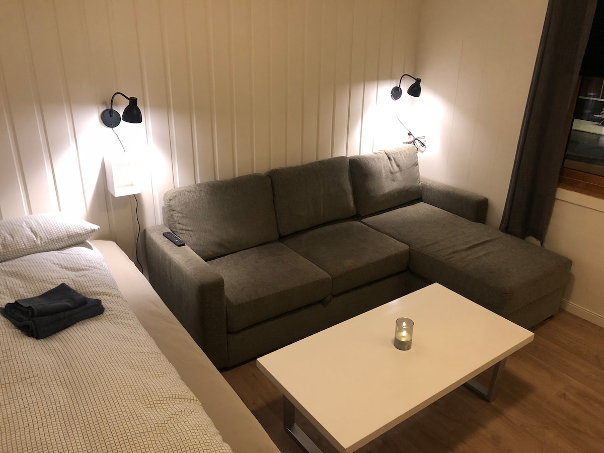 Studiolägenhet, som renoverades i början av 2021. Badrum med värmekablar. Säng i sovalkover. Utrymme för 2 i en liten dubbelsäng; 120 cm bred. Bäddsoffa som är enkel, dvs. plats för 1 person. Egen ingång. Värmekablar i vardagsrummet. Parkering är möjlig. Livsmedelsbutik och busshållplats 2 minuters promenad bort. 20 minuters promenad till centrum och 15 minuters promenad till landsbygden. Bergsliften är nästan närmsta granne. Boendet ligger centralt i Tromsdalen.