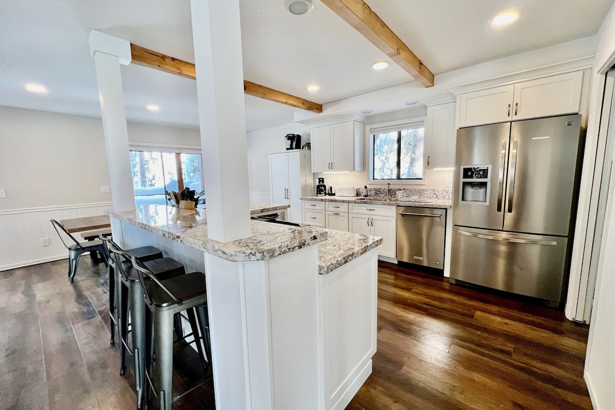 Kärleksfullt ombyggt sjöhus, populärt läge — 1 kvarter från Donner Lake bryggor och en snabb bilresa till 5 skidorter (Sugar Bowl, Palisades, NorthStar) på vintern (10–20 minuter), och en 5 minuters bilresa till charmiga centrum Truckee! Ett måste är 5 minuters promenad till brunchen vid sjön på Donner Lake Kitchen, eller mysa med gasspisen, brädspel, biljardbord och ett uppdaterat välfyllt kök. Enkel åtkomst till Bay Area med platt uppfart. Max 7 gäster, 3 bilar/2 på vintern. Truckee STR-tillstånd: 003384.