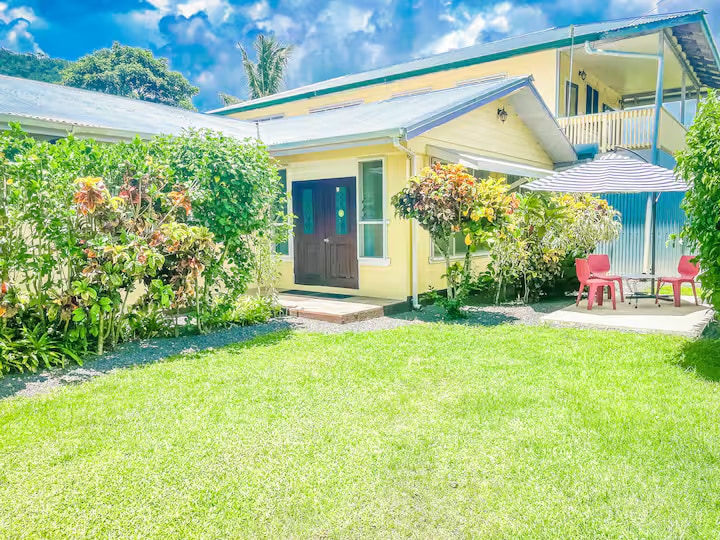 Lätt, upphöjt, blygsamt fristående semesterhus i det milda klimatet "upcountry". Lummig utsikt över trädgården. Inhägnad, enkel tillgång, stora platta gräsmattor. Den perfekta basen för dina semesteräventyr, familjebesök eller att bosätta dig som nyinvånare i Samoa. 15 minuters bilresa nerför berget norrut (Apia - shopping, nattliv etc.) eller söderut (resorter/stränder/naturpromenader). Nära Baha'i Temple & Montessori-skolan. Rabatter för långtidsvistelser.