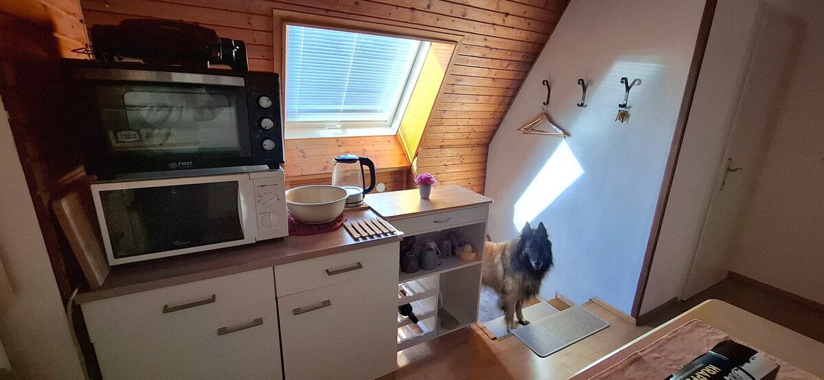 Den ljusa och mycket lugna lägenheten ligger på takvåningen i en villa. Tillgängligt via en egen trappa finns ett förrum med kök, ett stort vardagsrum (matbord, hörnsoffa och TV), tre separata sovrum, ett badrum och en toalett, allt på en nivå. I den 2000 m² stora och runt inhägnade trädgården finns det många mysiga platser för avkoppling. Från maj till oktober kan du använda poolen, som värms upp av solpaneler.