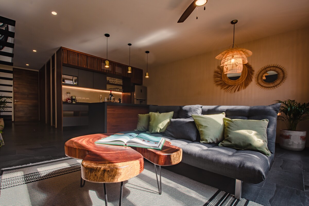 Unveil contemporary luxury at our new jungle condo. With expansive windows and double-height ceilings,this unit is bathed in natural light, creating a unique and inviting atmosphere.Relax in the king-size bed overlooking the social area or step outside to your private swim-up pool.Take the elevator to Tulum's #1 rooftop terrace for stunning views.Enjoy 200 mb internet and a central location between downtown Tulum and the beach,ideal for exploring shops, dining, and the beautiful beaches of Tulum