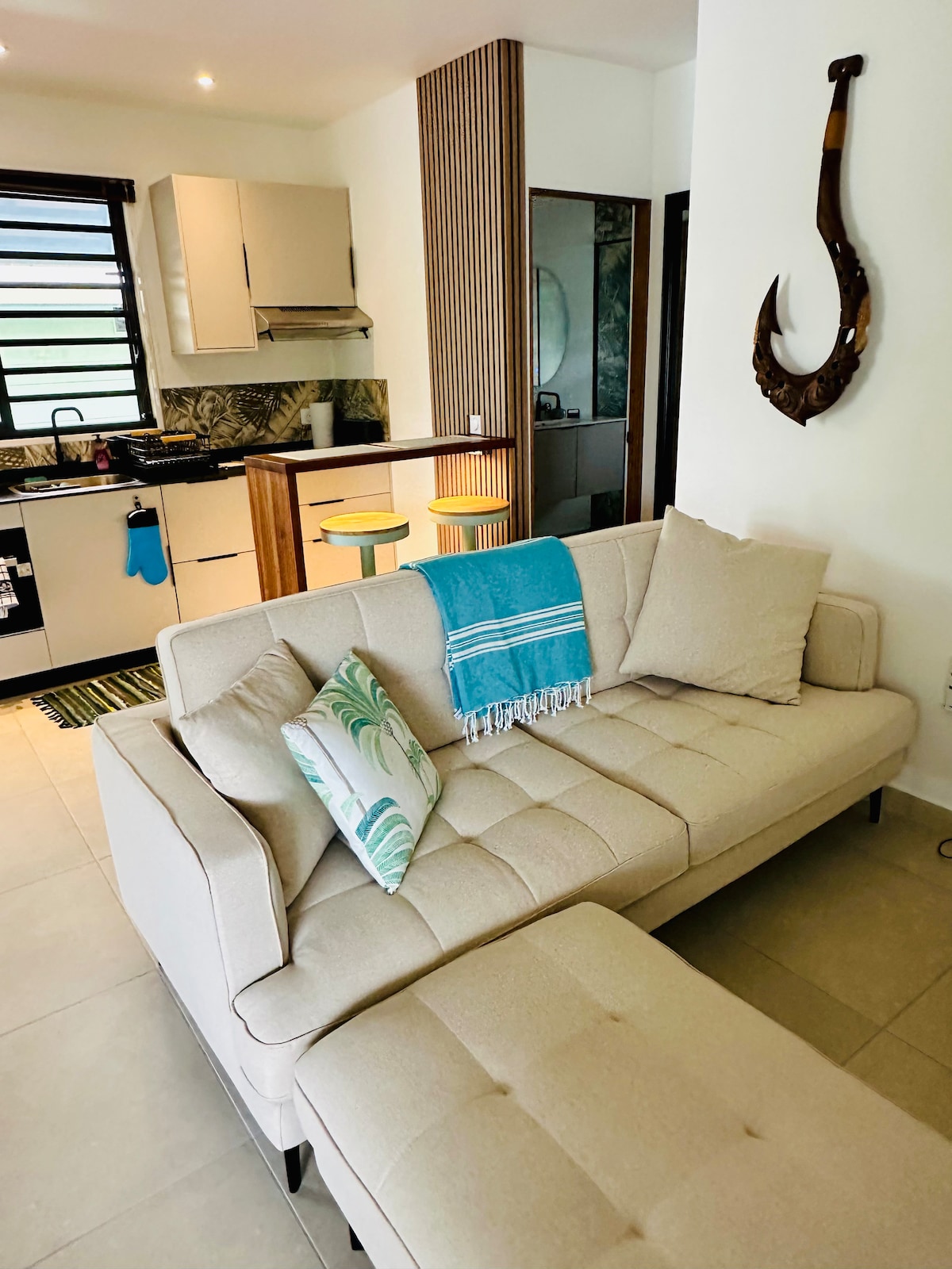 Beläget vid ingången till de vackraste turistattraktionerna i Raiatea, är du på den perfekta platsen för att njuta av öns naturliga skönhet. Denna vackra duplex (under ombyggnad) ligger vid ingången till den vackraste bukten i Polynesien. Du kan koppla av med utsikt över den vackraste bukten i Polynesien, snorkla, paddla kajak, och se mantor i Faaroa Bay. Du har tillgång till kajaker och cyklar gratis. Det luftkonditionerade boendet med utsikt över havet har ett eget kök