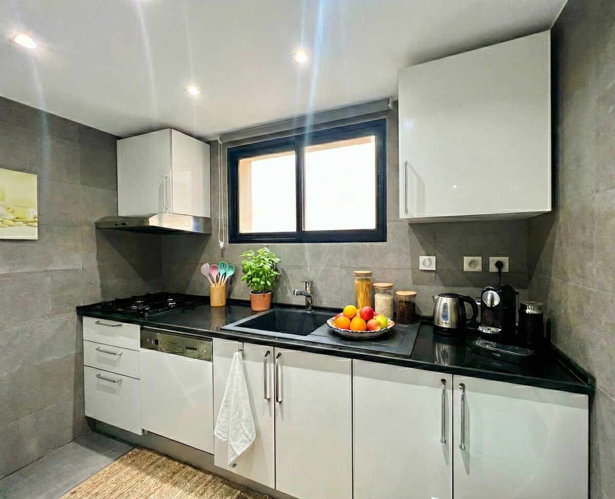 I Sidi Bou Saïd, i en oas av tystnad och ljus, blandar denna stora ljusa S1 arabisk-andalusisk tradition och modern komfort. Eldstad, blommig terrass, valv, zelliges och handgjorda möbler skapar en unik atmosfär. Fullt utrustat kök, höghastighets Wi-Fi, TV med alla kanaler, filmer och serier, snygga sängkläder. 15 minuters promenad: blå gränder, kaféer, hav och lokala smaker. Perfekt för att skapa, ladda om, fly eller helt enkelt andas.