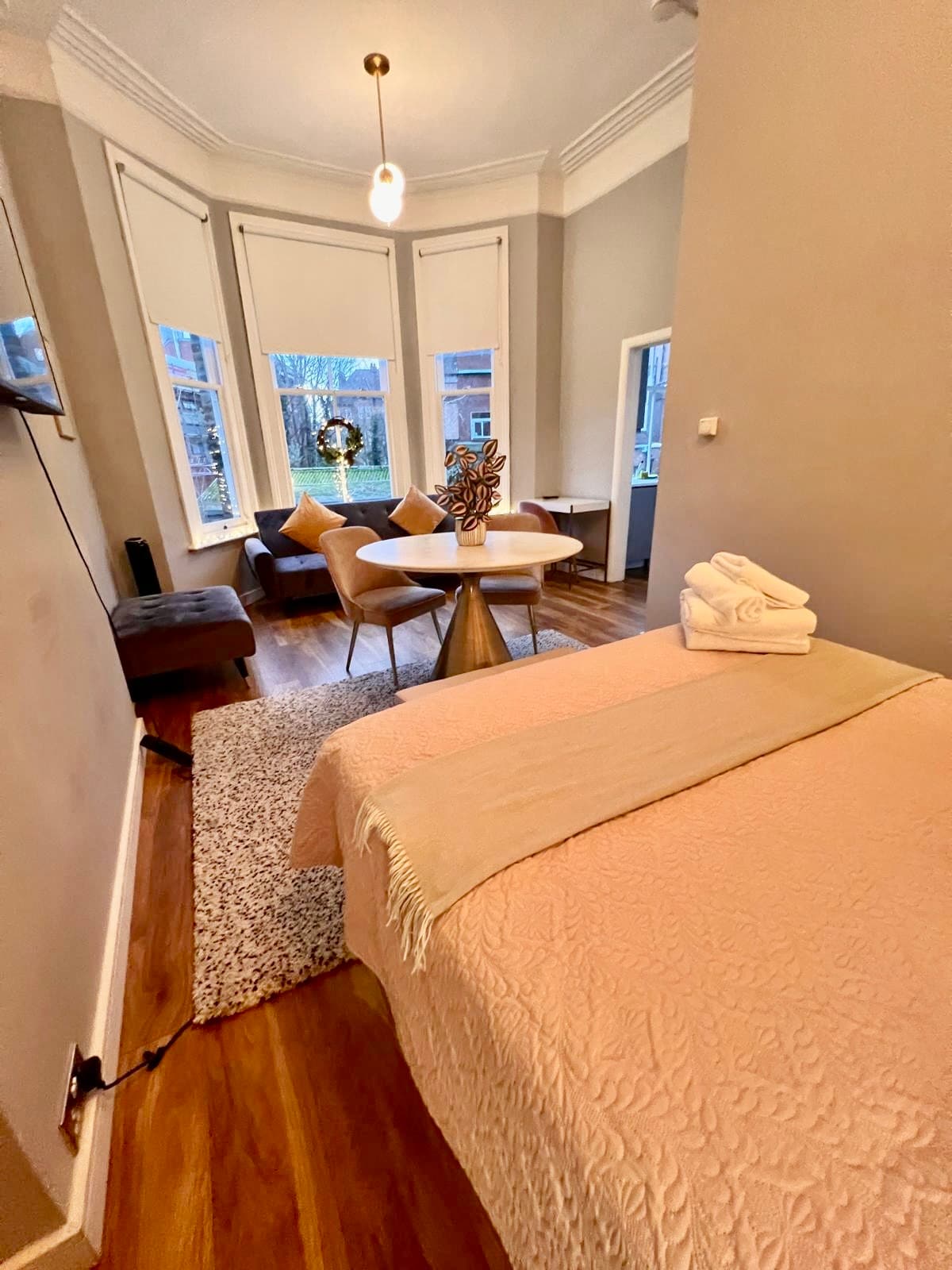 En modern trädgårdsannex med ett sovrum och privat trädgård. Bra förbindelser till stadens centrum, gångavstånd till parker/butiker. Öppet vardagsrum med fullt utrustat kök. Separat tvättstuga, badrum (bad/dusch) och sovrum med dubbelsäng (bra förvaring). Lägenheten är privat och intill ägarens hem. Faciliteter inkluderar: Wifi (70 Mbps nedladdning och 18 uppladdning) TV/Sky/Netflix, tvättmaskin, torktumlare och frys. Det finns ett säkerhetsskåp för värdesaker och rök-/koldioxiddetektorer.