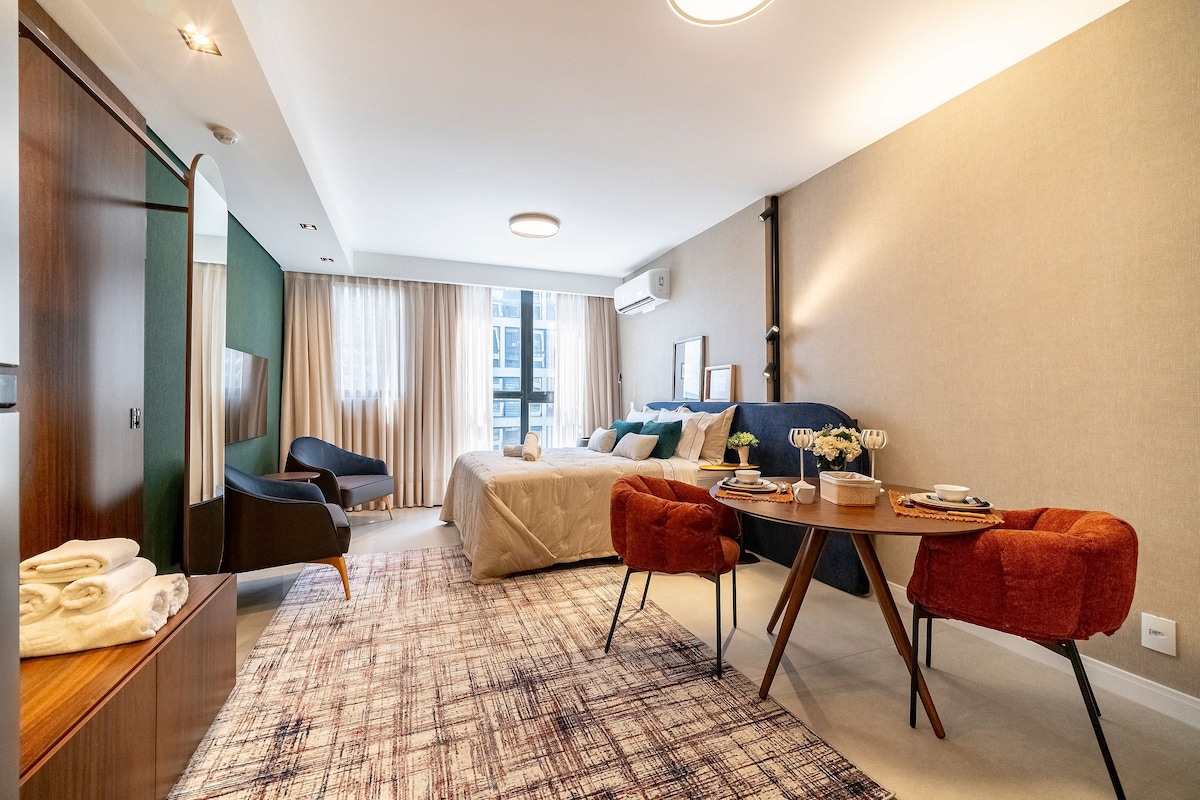 Helt ny studio, inredd med moderna möbler, i Espaço Viva Trindade, Torre Apart, intill UFSC, framför universitetssjukhuset och nära Shopping Villa Romana. I utvecklingen har gästen tillgång till restauranger, kaféer och barer i Food Hall, samt en stormarknad på bottenvåningen. Perfekt för par, studenter, yrkesverksamma och familjer med ett litet barn. Detta unika ställe har en mysig och välkomnande stil, så att gästen/gästerna känner sig bekväma hemma.