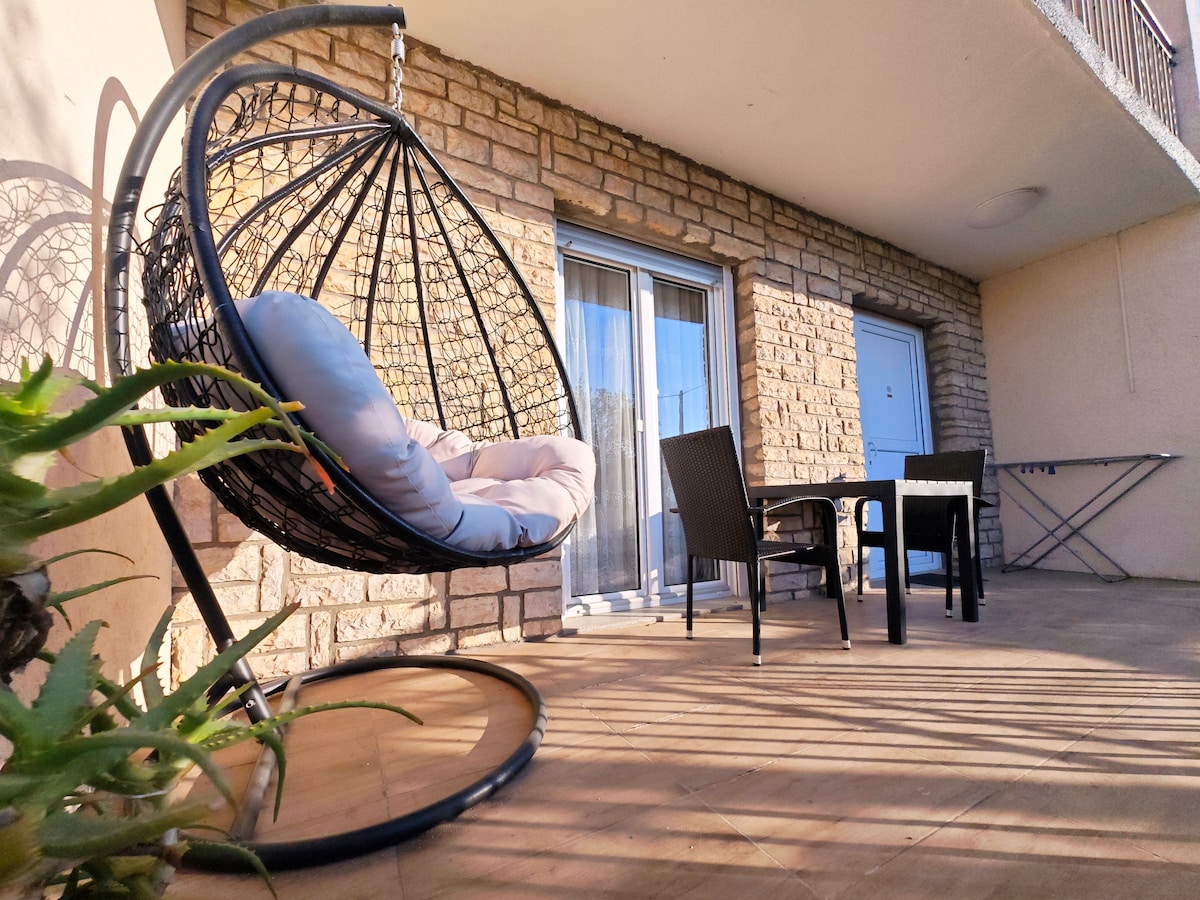 Mysig lägenhet är en del av familjehus, precis intill stranden. Många andra, allmänna stränder finns i grannskapet. Denna 3-stjärniga lägenhet har 1 sovrum, ett vardagsrum (utdragbar soffa), fullt utrustat kök med kaffemaskin och kylskåp, och ett badrum med dusch. Luftkonditionering, Wi-Fi och parkering är gratis för våra gäster. Perfekt för 2+2 personer Alla våra gäster kan använda solstolar gratis. Endast 2 km från nationalparken "Paklenica"