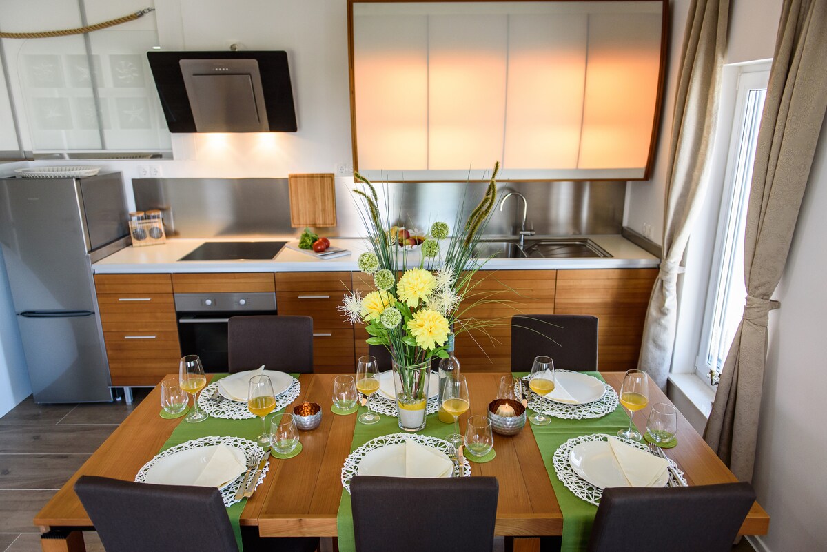 Detta eleganta boende är perfekt för familjer och grupper. Med egen ingång på översta våningen kan du njuta av avskildhet och en unik utsikt över havet. På 3 minuters promenad finns en strand med en restaurang och bar, samt en liten frukt- och grönsaksstånd, ett litet bageri med färskt bröd varje dag och en glassstånd. Zadar flygplats och Zadar II motorvägsförbindelse ligger 15 minuter bort. Utomhuslekplats: basket, fotboll, volleyboll, etc.
