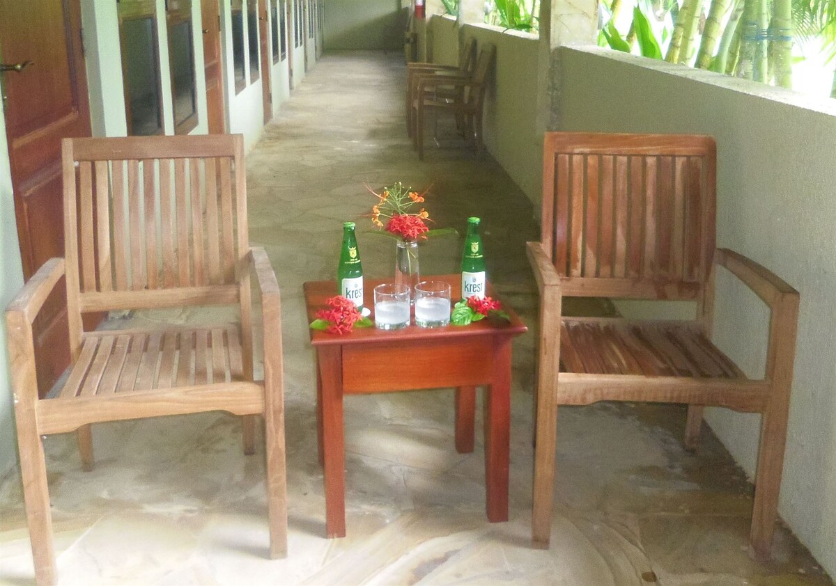 Detta rum med havsutsikt på bottenvåningen har en möblerad utomhusterrass med direkt tillgång till stranden och rymmer upp till 2 personer. Det är inrett i ljus, modern swahilisk stil med havsutsikt och har eget badrum med dusch och bidé. Rummet har trådlös internetanslutning, fläkt, luftkonditionering, te- och kaffefaciliteter, värdeskåp och hårtork. Alla rum städas och servas dagligen.
