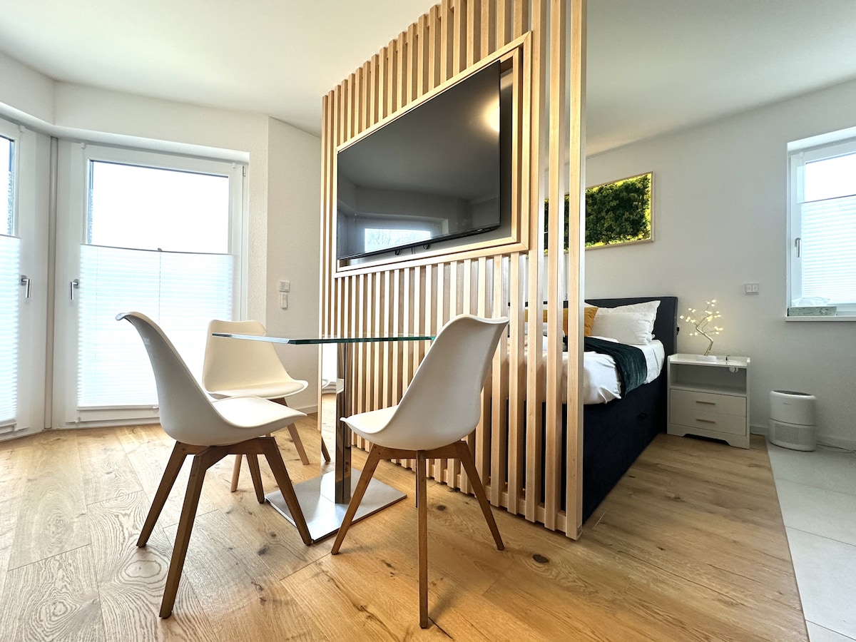 ☆ YAYstay – Njut av en avkopplande tid i vår kärleksfullt och stilfullt inredda 38 m² stora lyxiga studio på andra våningen med hiss (barriärfri tillgång) Oavsett om du är ensam, som ett par eller som en familj, även för att besöka, finns allt där: - 1 x dubbelsäng med boxspring - 1 x bäddsoffa 140/200 - Smart-TV 56' - Helautomatisk kaffemaskin - Spis + ugn - tvättmaskin och torktumlare i källaren Den vridbara TV-skärmen – en riktig blickfångare! Vi tillhandahåller högkvalitativa lakan och handdukar.