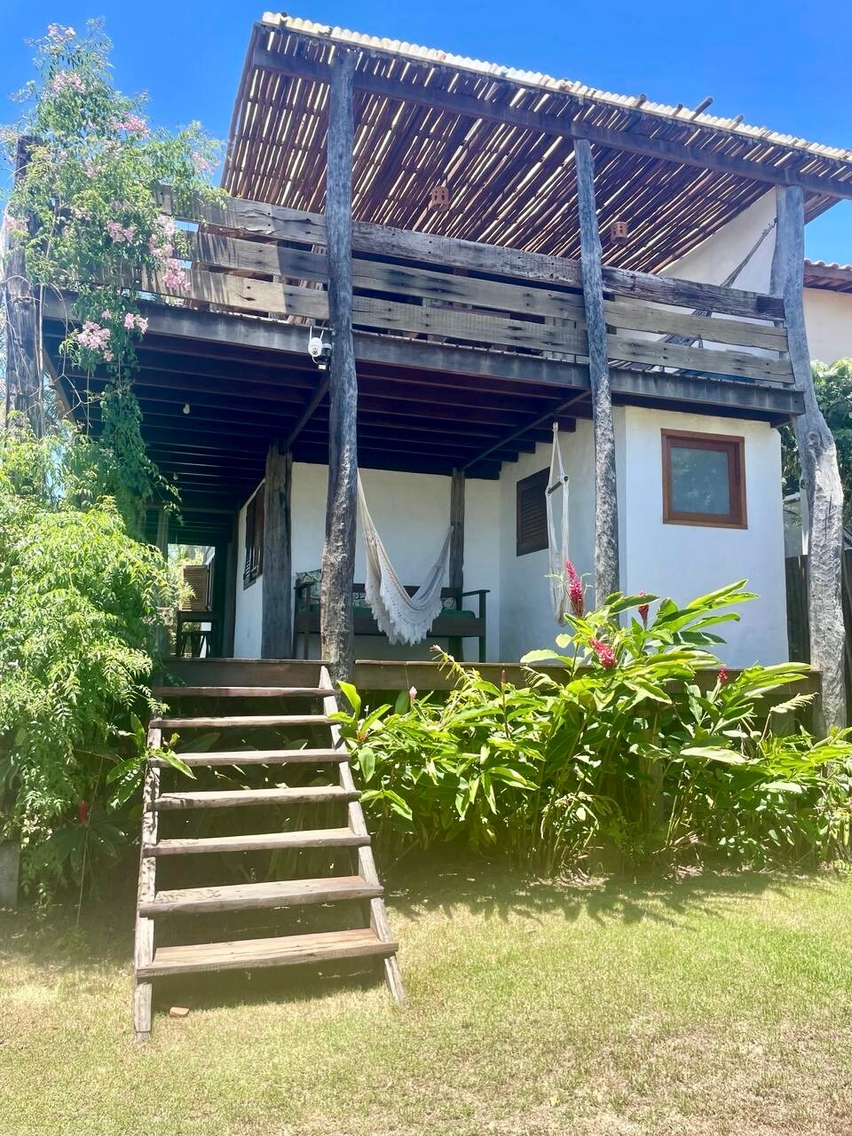 Njut av denna charmiga 18 m² stora svit, en oas av lugn och välbefinnande mitt i naturen. Den har en queen säng med ett myggnät, luftkonditionering, naturlig belysning och en balkong med en hängmatta. Rustik och handgjord dekoration, skapad av ägaren, och arbetsyta med bra internet. Uteköket är utrustat, inklusive grill. Hållbar, med solvärme och avfallssortering, samt en extern dusch för större bekvämlighet efter stranden.