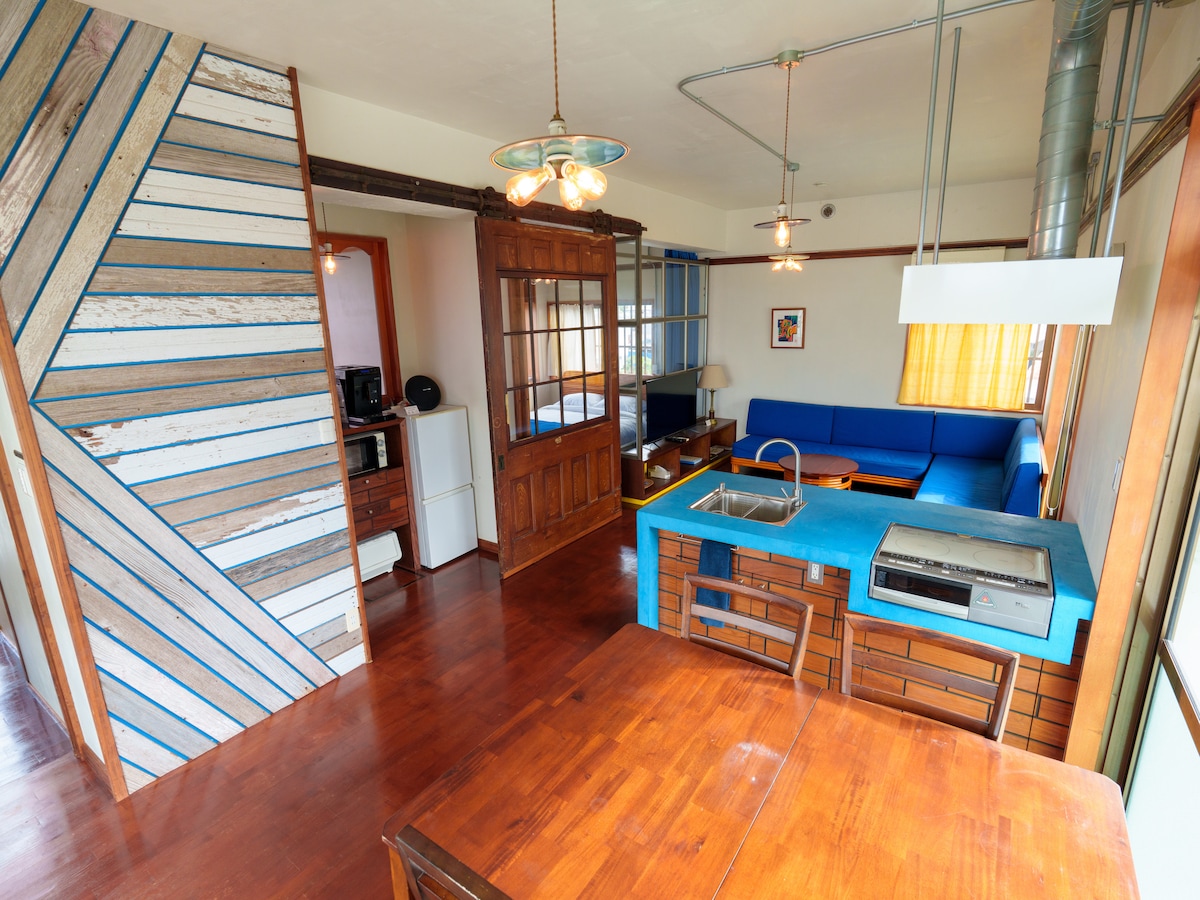 Vårt boende ligger på den avlägsna ön Hamahiga, som är ansluten till huvudön Okinawa via en bro. Stranden ligger ungefär en minut till fots från boendet, och det är en mycket lugn och naturlig miljö långt från allt buller. Det finns en myt som säger att Ryukyu-gudarna bodde på Hamahiga-ön, och än i dag värdesätter lokalbefolkningen traditionell kultur och evenemang, och en helig atmosfär omger hela ön. Du kommer att känna att du kan ladda mycket bra energi för både kropp och själ genom att bo på Hamahiga-ön. Behaglig öbris. Njut av den vackra solen och solnedgången, och den stjärnklara himlen som ger en imponerande tid på vårt boende. * Andra våningen i ett tvåvåningshus är helt och hållet ett gästrum. Du går upp till andra våningen via en entré och trappa som är avsedd för gäster. (1F är värdfamiljens bostad och butik.) * Rabatt för långtidsvistelser.