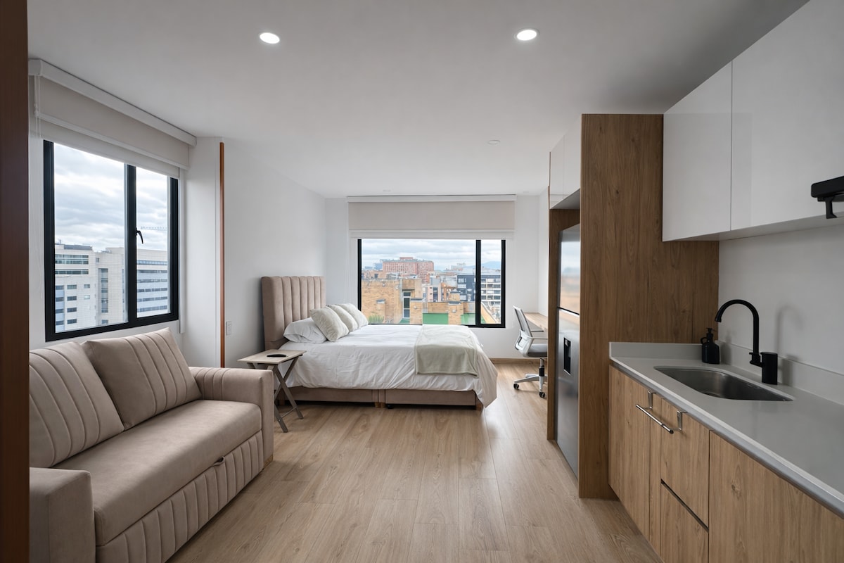 Njut av lyx i denna moderna studiolägenhet med hisnande utsikt över staden i Bogotás exklusiva stadsdel Usaquen. Njut av en oas på taket med eldstäder, grill och en panoramalounge. Inuti kan du koppla av i ett designutrymme med kök, snabbt wifi, smart-TV, tvättmöjligheter i lägenheten och husdjursvänlig komfort. Arbeta på distans i det lokala kontorsdelningsområdet. Gå till Usaquen, de bästa restaurangerna, kaféerna och nattlivet. Perfekt för chefer, par och eleganta resenärer.
