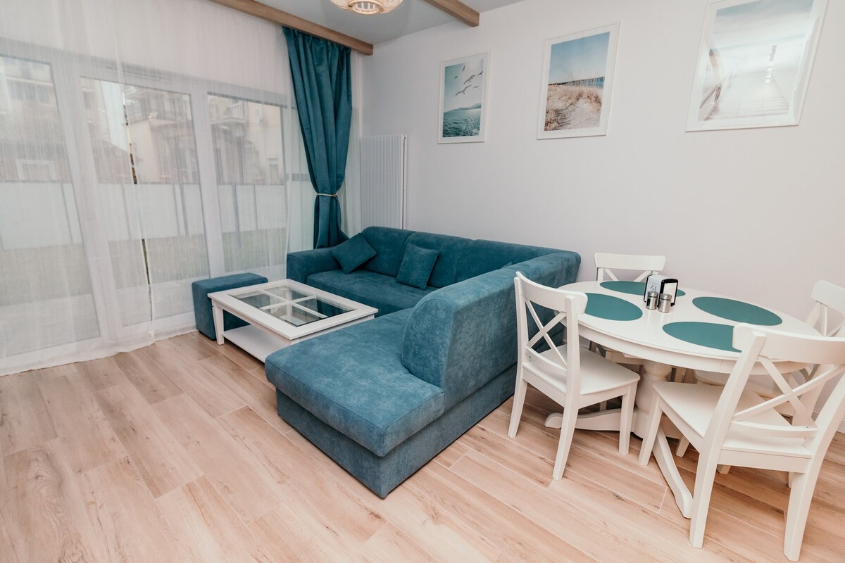 Elegant lägenhet i hjärtat av Kolobrzeg är utformad för upp till 6 personer. Det finns ett kök med en matplats på ca. 95 m2 öppen till vardagsrummet. En sittgrupp med en 75 tums TV med en smart funktion och en bäddsoffa. Två låsbara sovrum ger stor komfort. Det stora sovrummet har en dubbelsäng på 160x200 cm och ett sminkbord med spegel. I det andra sovrummet finns två enkelsängar 90x200 cm. Båda sovrummen har tillgång till en balkong.