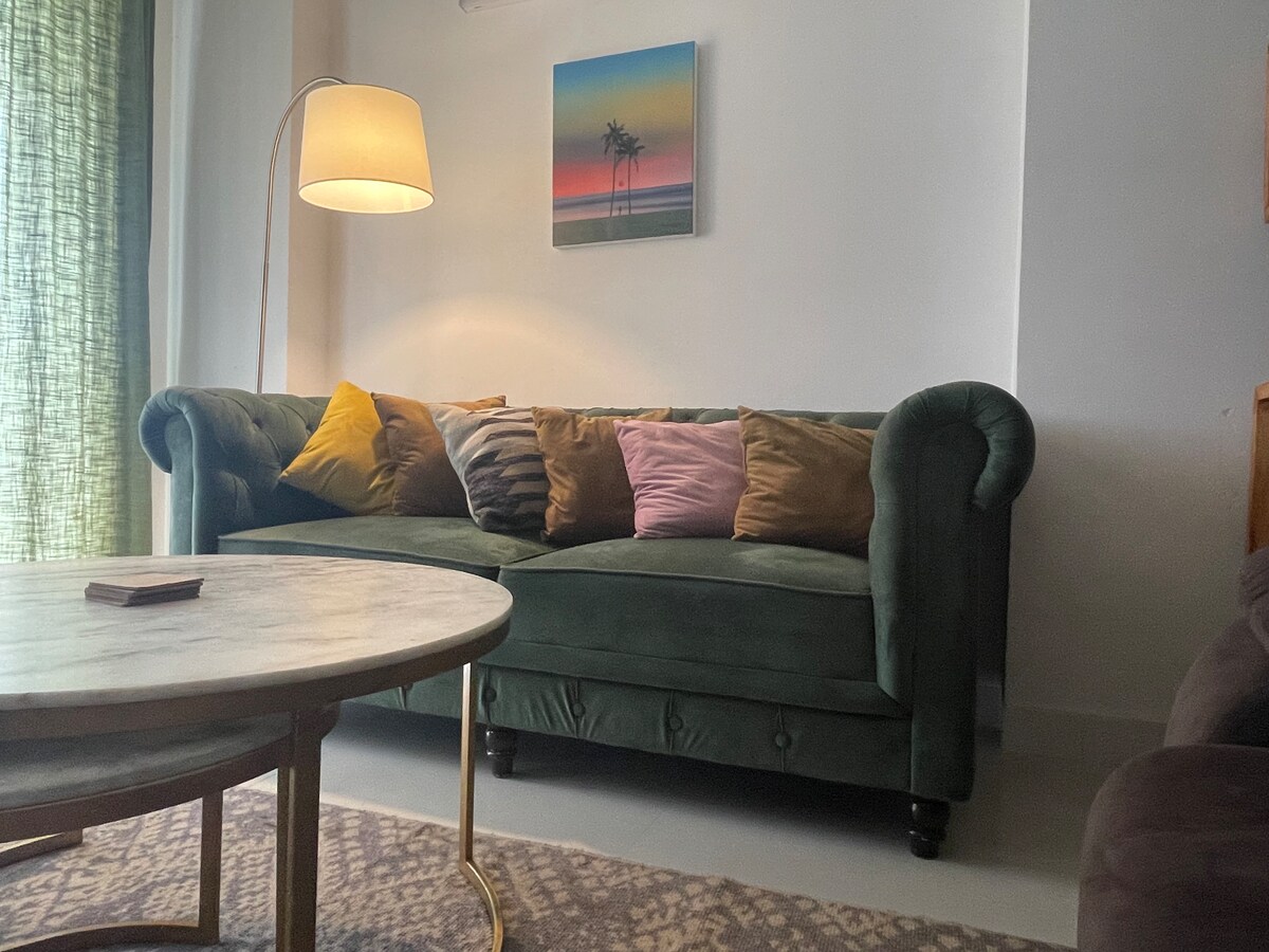 Välkommen till Green View: en lyxig och charmig lägenhet med 3 sovrum på bottenvåningen i Saket, södra Delhi. Beläget 5 minuter från tunnelbanestationen Malviya Nagar och köpcentren PVR Anupam och Select City/DLF. 3 sovrum med eget badrum och kingsize-sängar, angränsande badrum, luftkonditionering, värmeelement, luftrenare, smart-TV och förstklassiga sängkläder. Koppla av i det solfyllda vardagsrummet, det fullt utrustade köket med matplats och gå ut i en stor park mittemot huset. En lugn, grön och bekväm stadssemester väntar.