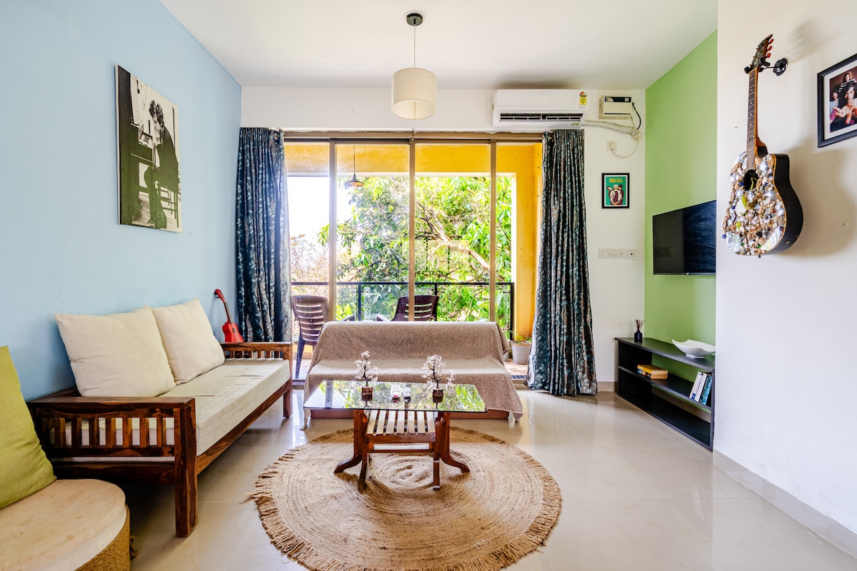 Bhoomi: Mysigt 1BHK-boende i Patnem, Goa med fantastisk utsikt och delad pool Med sin fantastiska utsikt över de frodiga landskapen och den gemensamma poolen erbjuder denna lägenhet den perfekta blandningen av lugn och bekvämlighet. Bekvämligheter: - 1 sovrum med dubbelsäng - Fullt utrustat kök - Vardagsrum med bekväma sittplatser - 2 balkonger med fantastisk utsikt - Delad pool - Boho-inspirerad inredning - Gratis Wi-Fi - Öppen parkering tillgänglig