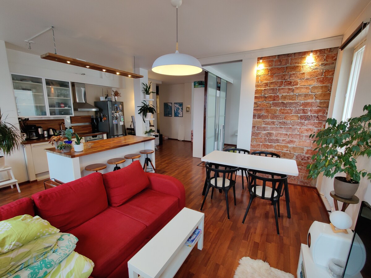 Välkommen till min moderna men mysiga vindsvåning i det bohemiska kvarteret Kallio! - Ingen städavgift - En välskött lägenhet med centralt läge - 20 minuter från flygplatsen - Glasad balkong med utsikt från taket - Luftkonditionering - Kaffe/tee - Fullt utrustat kök - Bekväm queen-säng - Tvättstuga - Diskmaskin - Mörkläggningsgardiner - Spel - Superlugnt - Belysning med olika scener som passar ditt humör - Restauranger och barer i närheten - Tunnelbana, spårvagn och busshållplatser i närheten - Stormarknad (öppen dygnet runt) bara 200 meter bort - Wi-Fi