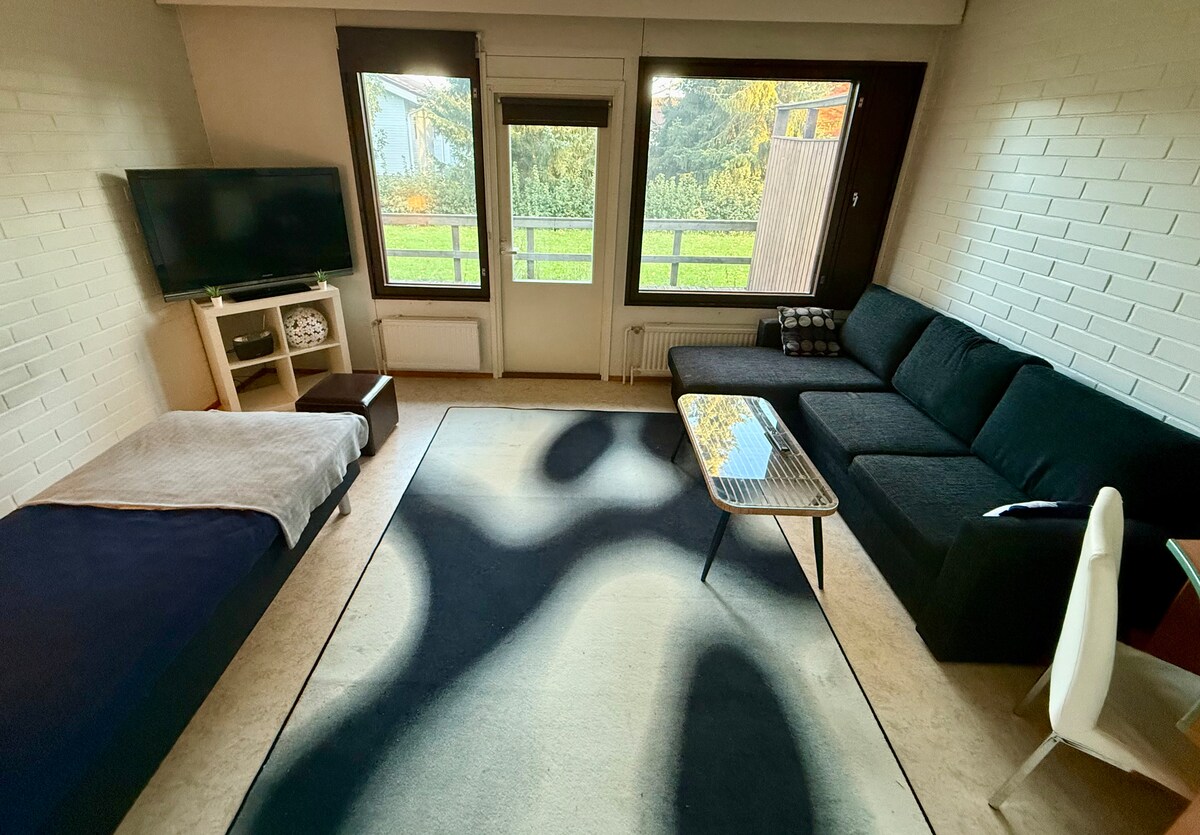 En mångsidig, hemtrevlig lägenhet för en eller två personer i Mynämäki. Vid behov kan även två barn få en säng i bäddsoffan. Lägenheten lämpar sig väl för den som söker lite lyx, som en lugn arbetsplats för distansarbete. Aarno1 har ett utmärkt läge när du reser på E8-vägen och alla byns tjänster är tillgängliga. Det lugna läget garanterar en god natts sömn. Aarno1 är utrustad med ett utomhusbubbelbad, 55"TV, snabb 5G Wifi-anslutning och alla hushållsartiklar.