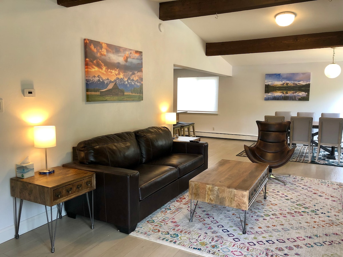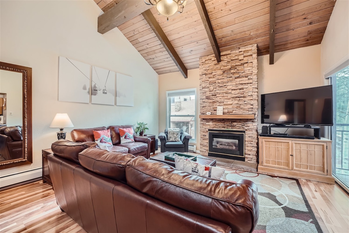 Solig lägenhet med 2 sovrum, 2 badrum, fönster från golv till tak och fri utsikt över Vail Mountain. Bottenvåningen har två rymliga vardagsrum, en matplats och ett öppet kök med välvda tak och massor av naturligt ljus. Den andra våningen har 2 sovrum, var och en med eget badrum. Du ligger bara några minuter från Vail Village, Lionshead, skidåkning, vandring/cykling, après-ski, restauranger, nattliv och shopping. Busshållplatsen ligger bara några meter från lägenheten om du föredrar att inte köra.