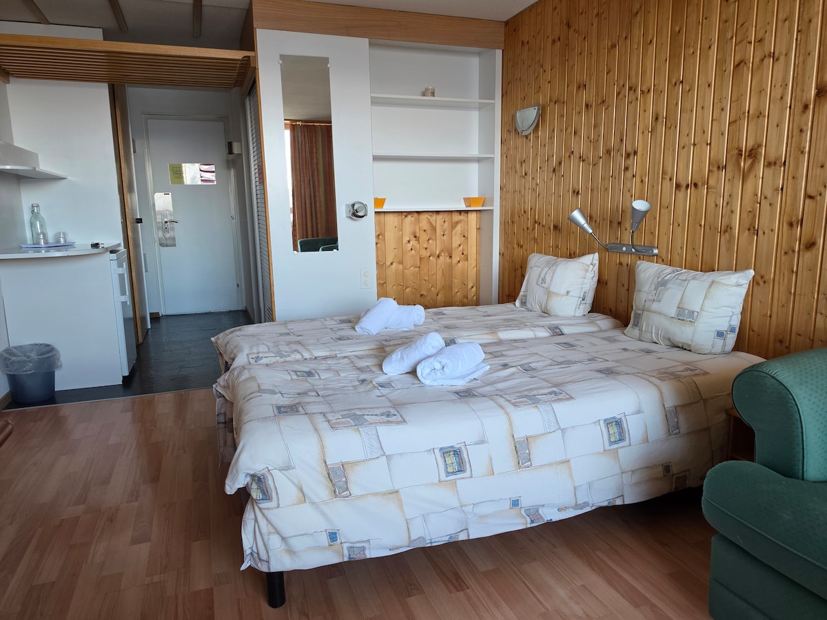 Studio de 27m2 avec balcon et magnifique vue sur les Alpes Valaisannes. Chambre avec TV, kitchenette, 2 lits simples, 1 salle de bain avec WC et baignoire.