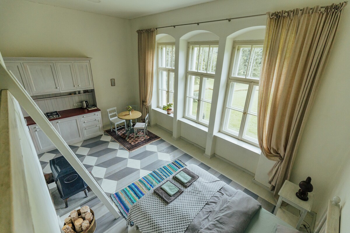 Koppla av i detta hus från slutet av 1700-talet, omgivet av en romantisk landskapsträdgård med ett arrangemang från 1800-talet. Studiolägenheten har nyligen renoverats och uppfyller dagens standarder. Wi-Fi är tillgängligt, medan mobilsignalen är svag – vilket inbjuder dig att sakta ner och njuta av de lugna rytmerna på landsbygden. För närvarande bor en kreativ konstnärsfamilj på herrgården – Ieva och Kārlis Zemītis. Ibland öppnar de upp egendomen genom att organisera olika kulturella evenemang.