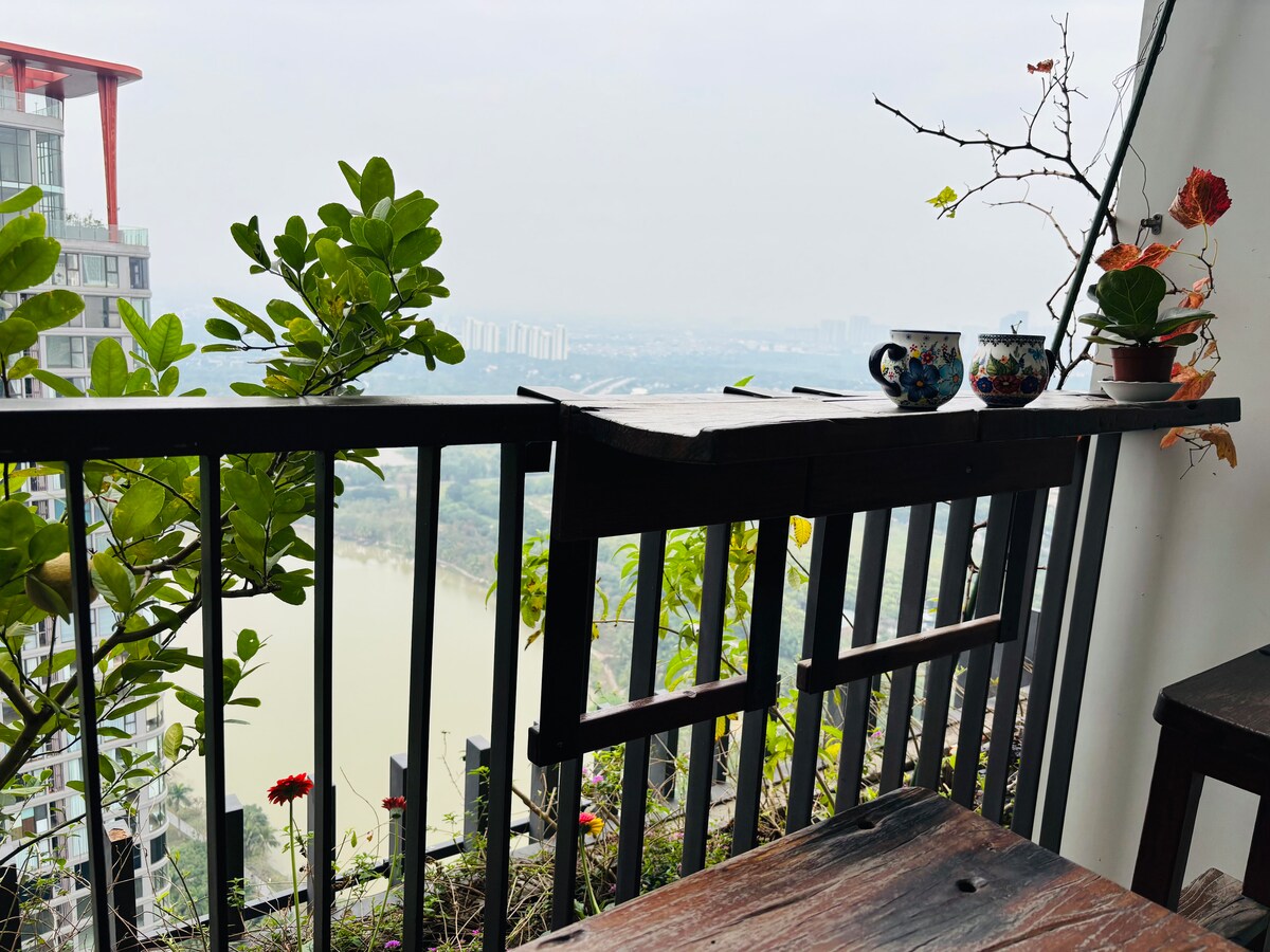 Lyxig japansk studio med 1 sovrum, 1 bäddsoffa och 1WC, stående dusch, smart Toto toalett – på Landmark 1, Swanlake Onsen, i det mest centrala läget i Ecopark – med utsikt över Red River, som ansluter till de omgivande områdena: Onsen varmt mineralbad, golfbana, EPGA golfakademi, matgata, stormarknad, restaurang, café, gym, spa, 4 säsongers utomhuspool, trädgård, japansk Koi fiskdamm...