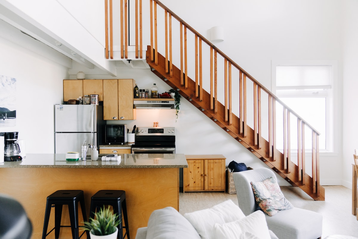 En nyrenoverad lyxig loftlägenhet med fantastisk utsikt över hamnen, havet och bergen. Mitt i hjärtat av Tofino med utsikt över First St Dock och stranden där gäster har tillgång till en kajakstart och picknickplats. Restauranger, affärer och livsmedelsbutiker ligger bara en kort promenad bort. Bara 10 minuters bilresa från de bästa surfstränderna som Chesterman Beach. Slå på eldstaden, titta på stormen och förundras över havsutsikten. Detta är det perfekta stället för en Tofino-semester!