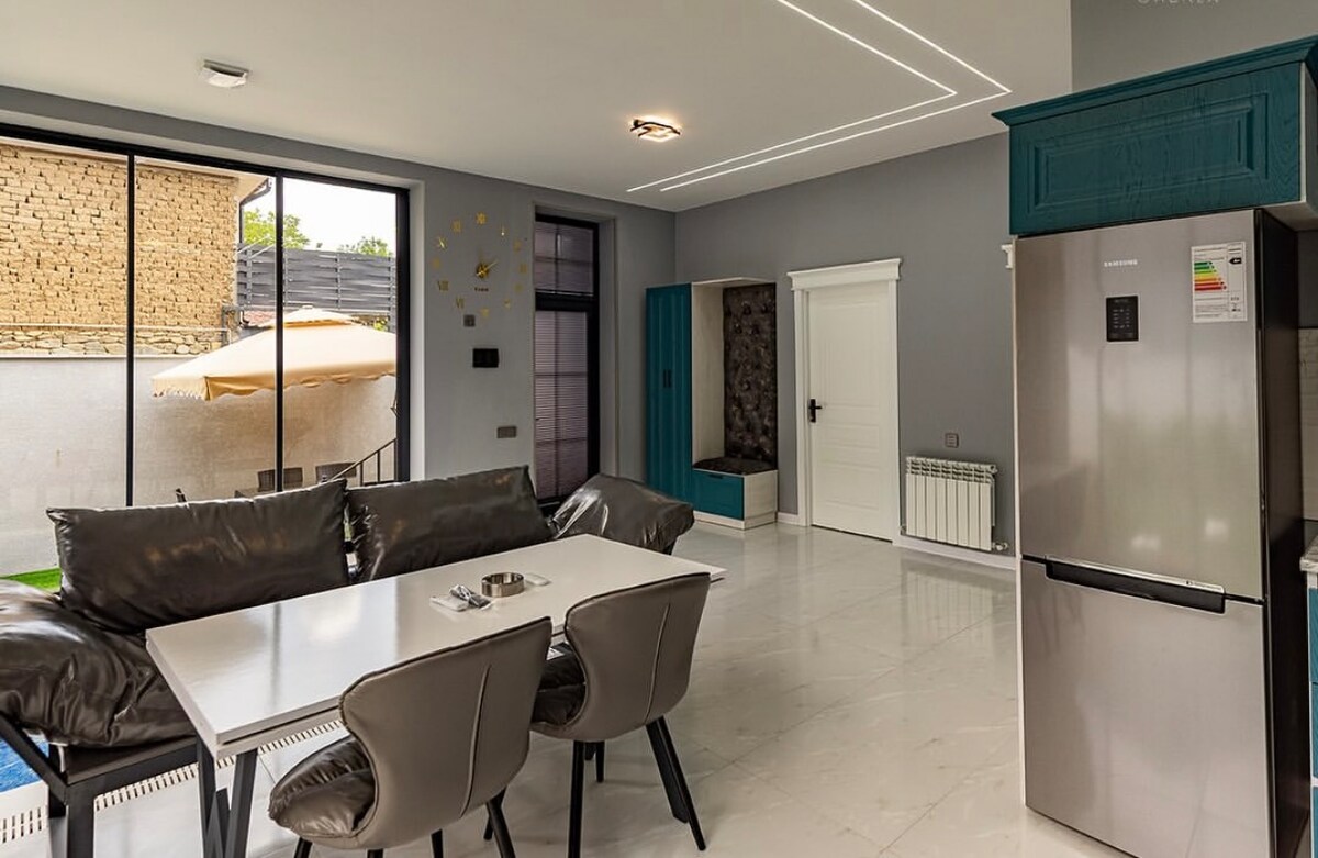 Stugan har 5 bekväma rum och 5 badrum, perfekt för att rymma upp till 12 gäster. Ett rymligt vardagsrum med panoramafönster erbjuder otrolig utsikt över bergen och poolen. Villan är utrustad med två pooler: en uppvärmd på gatan, den andra kyld inuti huset. Läget är hjärtat av turistområdet, bara 5 minuter med bil till de viktigaste attraktionerna i Kaukasus. Det är ett perfekt ställe för en oförglömlig semester med familj och vänner omgiven av berg och frisk luft.
