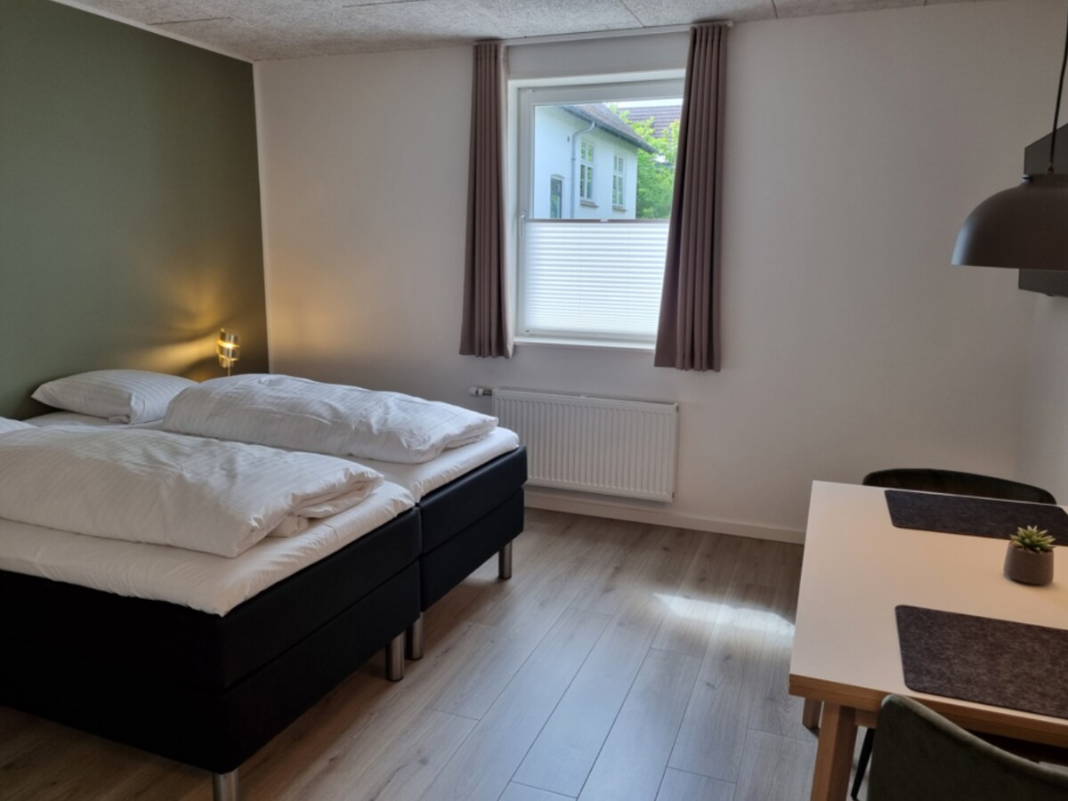 Du får din egen indgang til lejligheden. Fra soveværelset indgang til TV stue / tekøkken med mulighed for opredning til 2 personer på sovesofa. Fra TV stuen er der indgang til eget bad / toilet. Der vil være mulighed for at opbevare ting i køleskab med lille fryser. Der er el kedel så man kan lave kaffe og te. I tekøkkenet findes 1 mobil kogeplade og 2 små gryder samt 1 ovn Der må ikke steges i rummet. Kolde drikkevarer kan købes for 5 kr. og vin 35 kr. Betales kontant eller MobilePay.