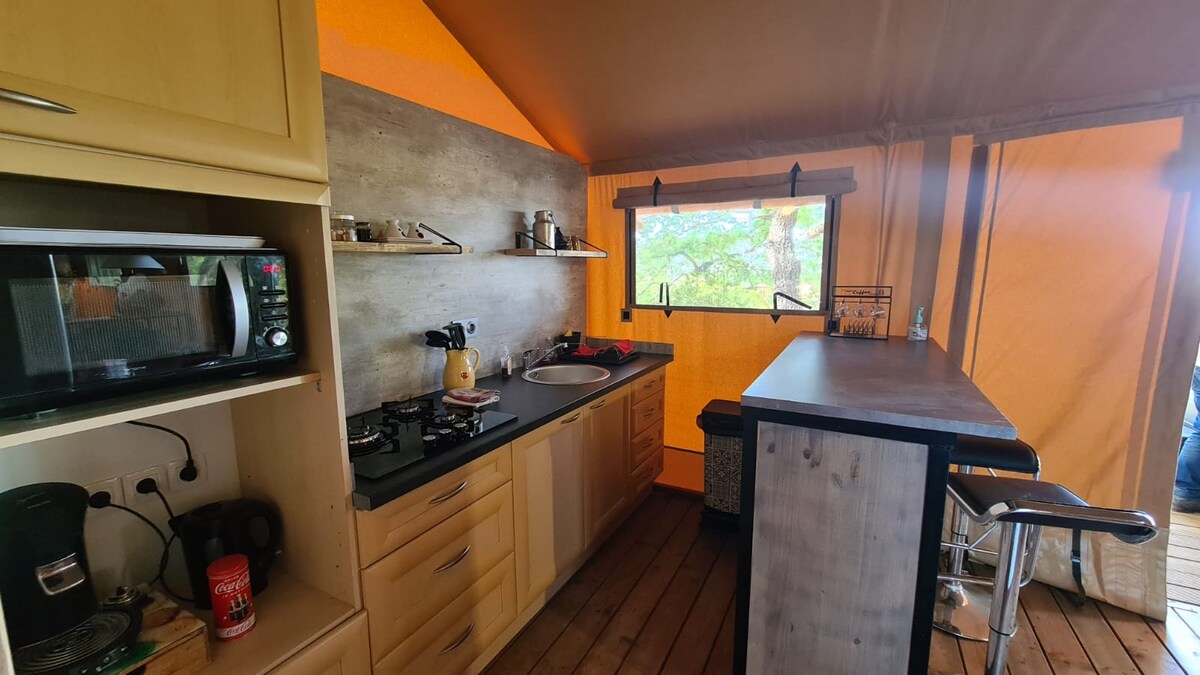 Det är en lyxig safari tält med 35 m2 vardagsrum, 2 sovrum och ett stort vardagsrum.Ett fullt utrustat kök ( induktionsplatta, mikrovågsugn, kylskåp, handfat) ligger på den täckta terrassen framför tältet. Ett badrum med dusch, toalett och handfat finns bredvid tältet i en separat timmerstuga. Gästområdet ligger på en separat nivå från huvudhuset och ligger vid poolen.