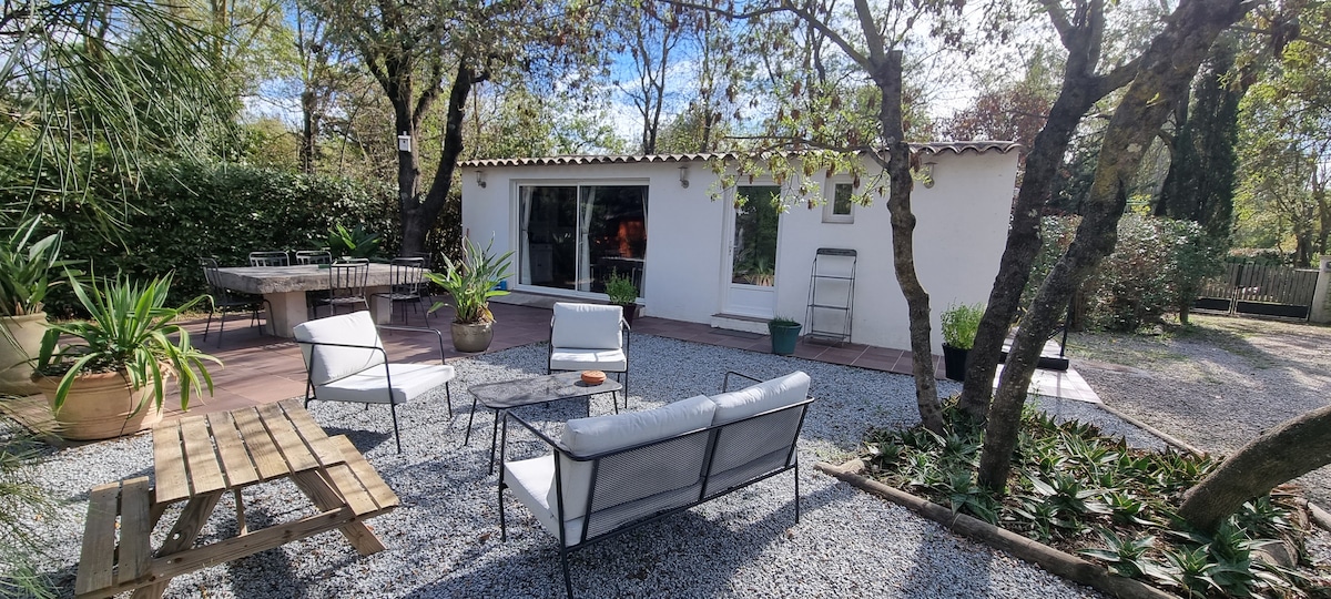 Låt dig vaggas av naturens ljud i detta unika boende med bohemiskt utseende på 30 m2 för en trevlig avkopplande vistelse Isolerat och privat utrymme på 100 m2 med utsikt över en olivlund. Utrustad med en stor komfortabel säng 160x200 och 2 fåtöljer (barnbädd) Soffbord inomhus kaffebryggare vattenkokare disk till ditt förfogande. Skyddad uteservering med bord 4 stolar belysning, handfat och vattenpunkt. Snyggt badrum på 25 m2 med dusch, toalett, handfat, kylskåp och mikrovågsugn