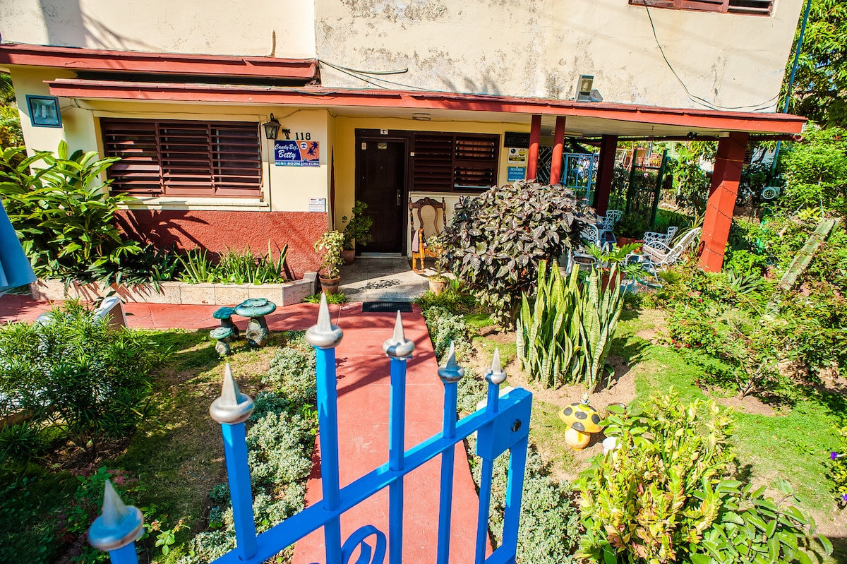 Es un apartamenento independiente amplio. Con un dormitorio con dos camas, (una grande y otra más pequeña), aire acondicionado, caja fuerte, perchas para la ropa y televisor. Un baño con agua fría y caliente; cocina equipada con todo para la elaboración de alimentos (microondas, cafetera, tostadora, ollas, fogón de gas, refrigerador), una pequeña mesa plegable y tres taburetes para comer, uso de la lavadora. Una terraza común rodeada de plantas con sillones, mesa y sillas y un hermoso jardín.