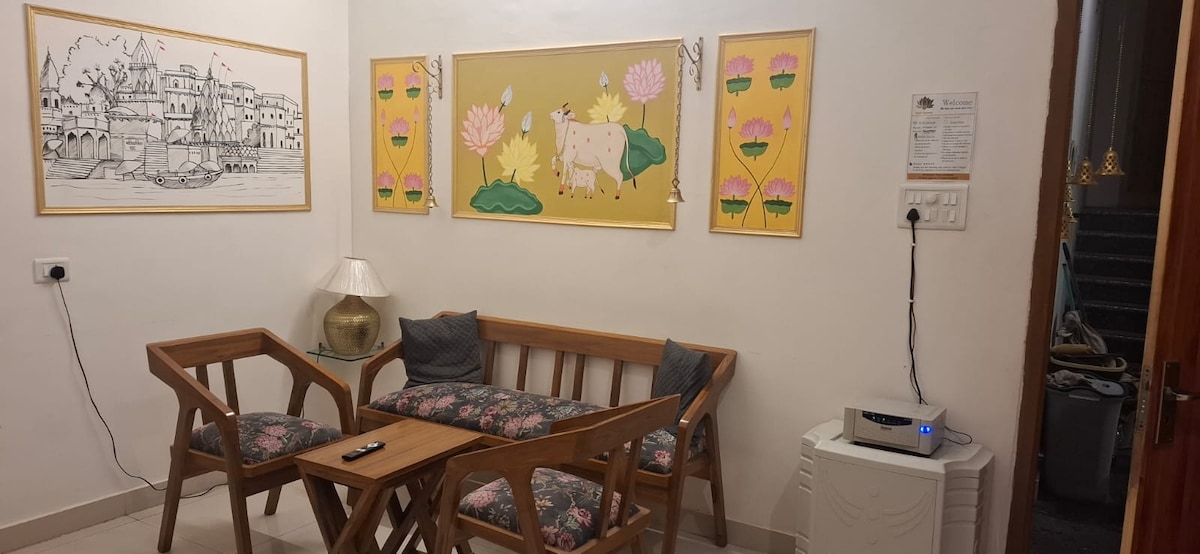 Välkommen till LUFTKONDITIONERADE The Lotus Feet! Anjana ger en riktig hemvistelse atmosfär. Gäster blir glatt överraskade över att hitta boendet så avkopplande och bekvämt! Jio 5G WIFI tillgängligt dygnet runt. Koppla av med hela familjen i detta fridfulla boende. 6 vuxna och 2-3 barn kan bekvämt bo här. Shri KASHI VISHWANATH JI bara 4 km härifrån. SANKAT MOCHAN 1 km. Restauranger och kaféer på 200/400 meter - MEDICINSK HJÄLP 200 m bort - BHU HOSPITAL, Butiker & Gallerior 200/500 m- HUSDJUR ÄR INTE TILLÅTNA